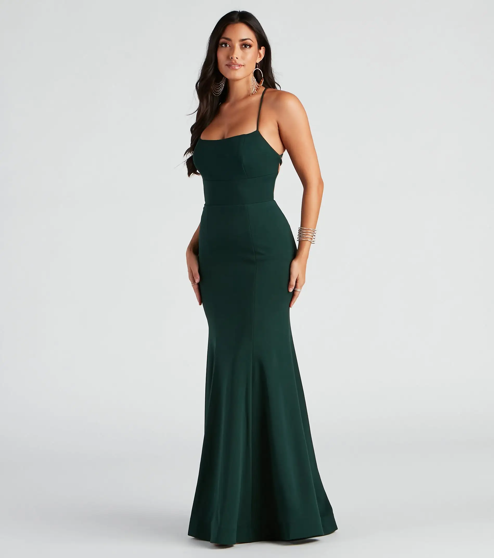 Lace-up for a glam night out in a dress that stuns from the moment you walk in. Eden features a sleeveless square neckline with a built-in padded bust, adjustable cross-straps, and an open-back with a sultry lace-up that lets you adjust the fit. Her bodice leads to a flowy mermaid silhouette that hugs your curves. The dress is composed of a lined crepe fabric with a moderate stretch. Complete look with