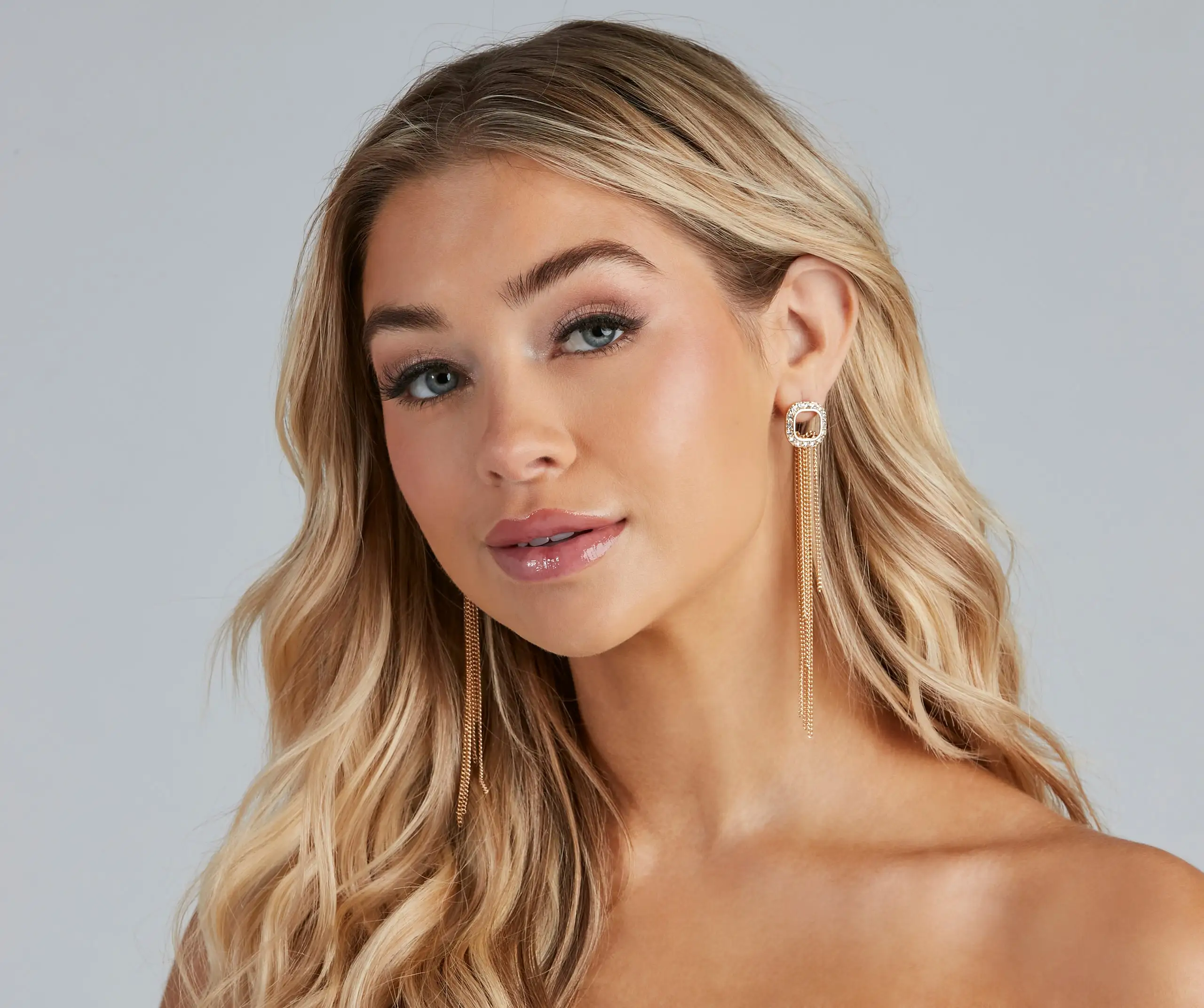Embody edgy-luxe vibes in these earrings feature a square rhinestone top with chain fringe and a post-back closure. Perfect for styling with a sleek