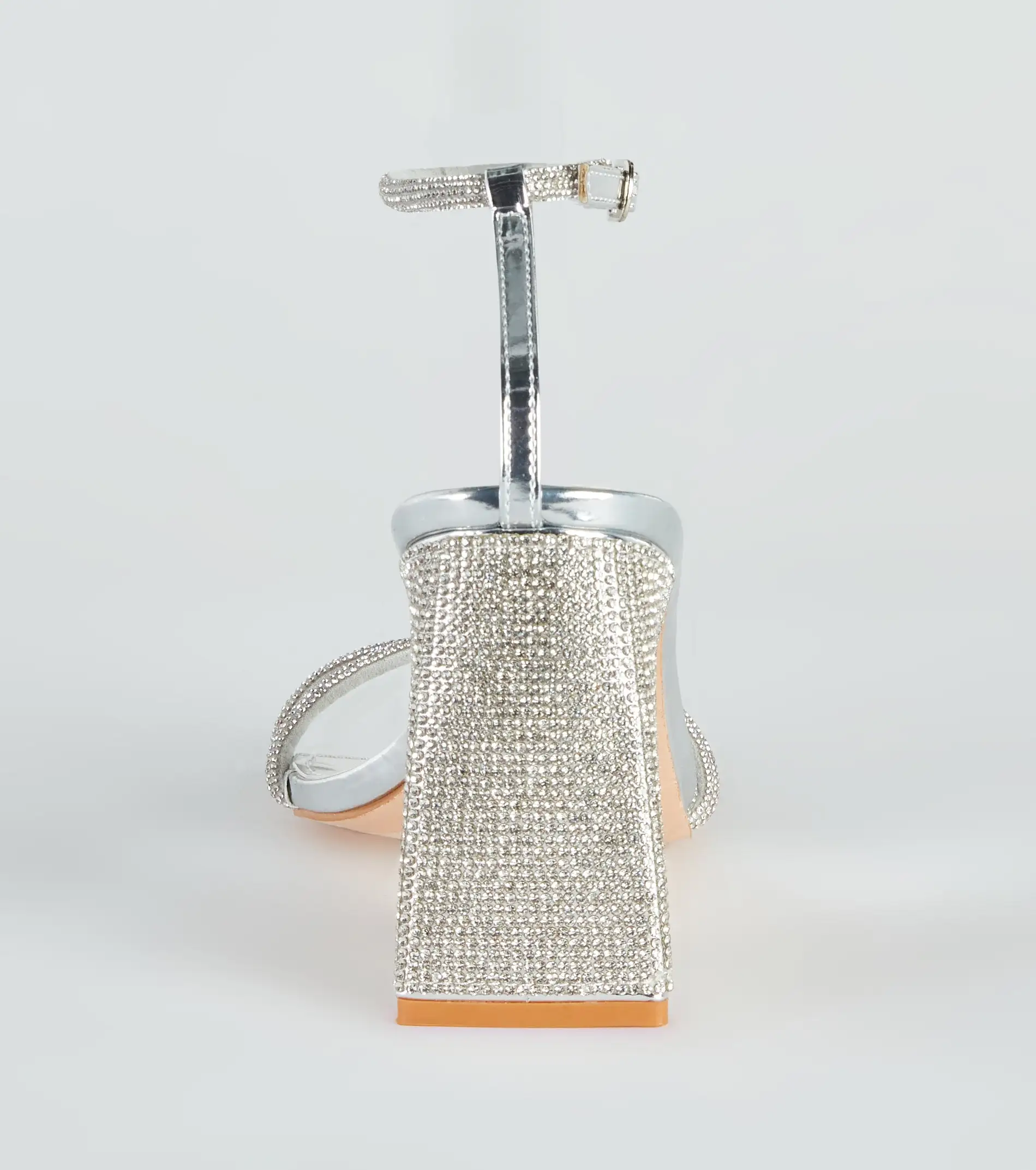 Elevate your look for a special occasion in these stunning heels featuring a sleek square toe, dual rhinestone toe straps, a metallic footbed, a triangular-shaped block heel embellished with rhinestones, and a rhinestone ankle strap with buckle closure. Complete the look with