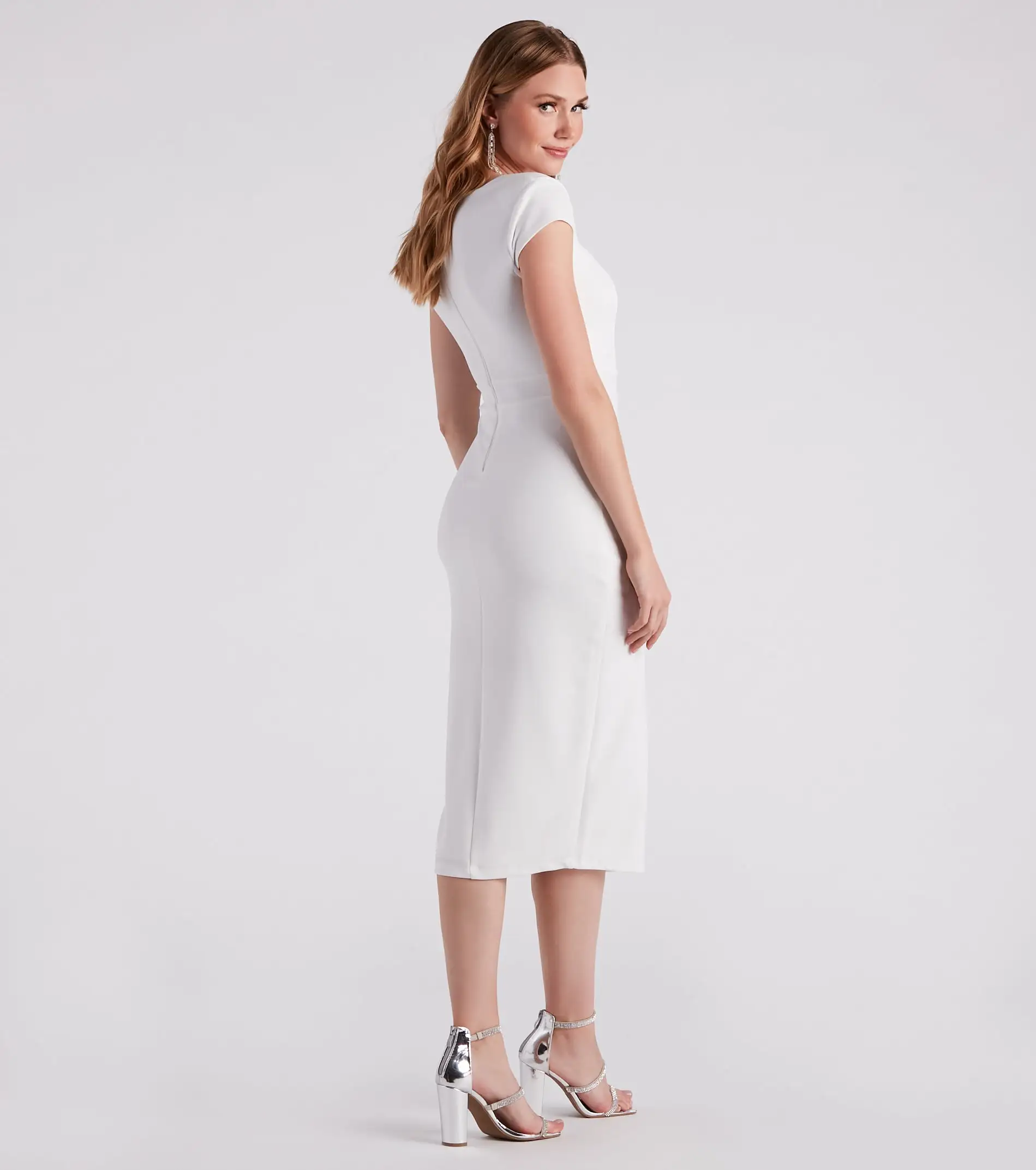 Chic with stylish sophistication, the Elise formal short sleeve midi dress is a staple for cocktail parties. She features a square neckline with a wired notched front design, short cap sleeves with shoulder pad inserts, high waist seams, a midi-length hem with an alluring high side slit, and a form-hugging silhouette. The smooth crepe fabric offers a moderate stretch. Perfect for brides, pair with