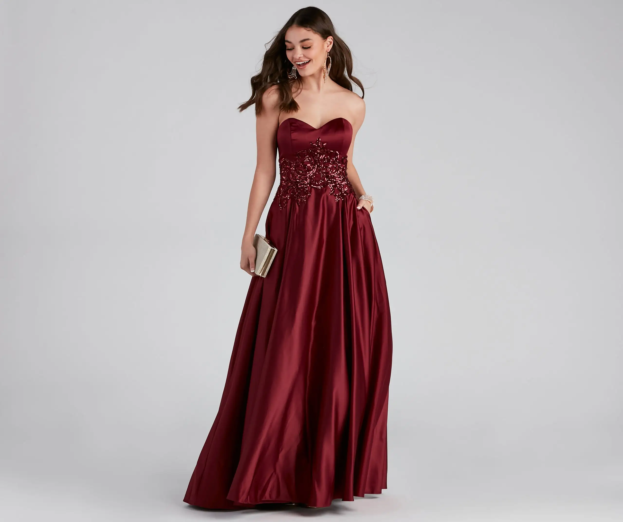 Lace up in a prom ball gown that will have you camera-ready for stunning pictures at prom! Ellie features a sleeveless sweetheart neckline with a built-in no-slip strip for a secure fit, and padded cups that add support. Her bodice features a damask sequin pattern that leads to a voluminous ball gown skirt with hidden side pockets and pleats. Her back stands out with a stunning lace-up closure that provides a customized fit. She is composed of a lined woven satin fabric that offers a flowy fit with minimal stretch. Includes additional lining and petticoat. Complete prom outfit with
