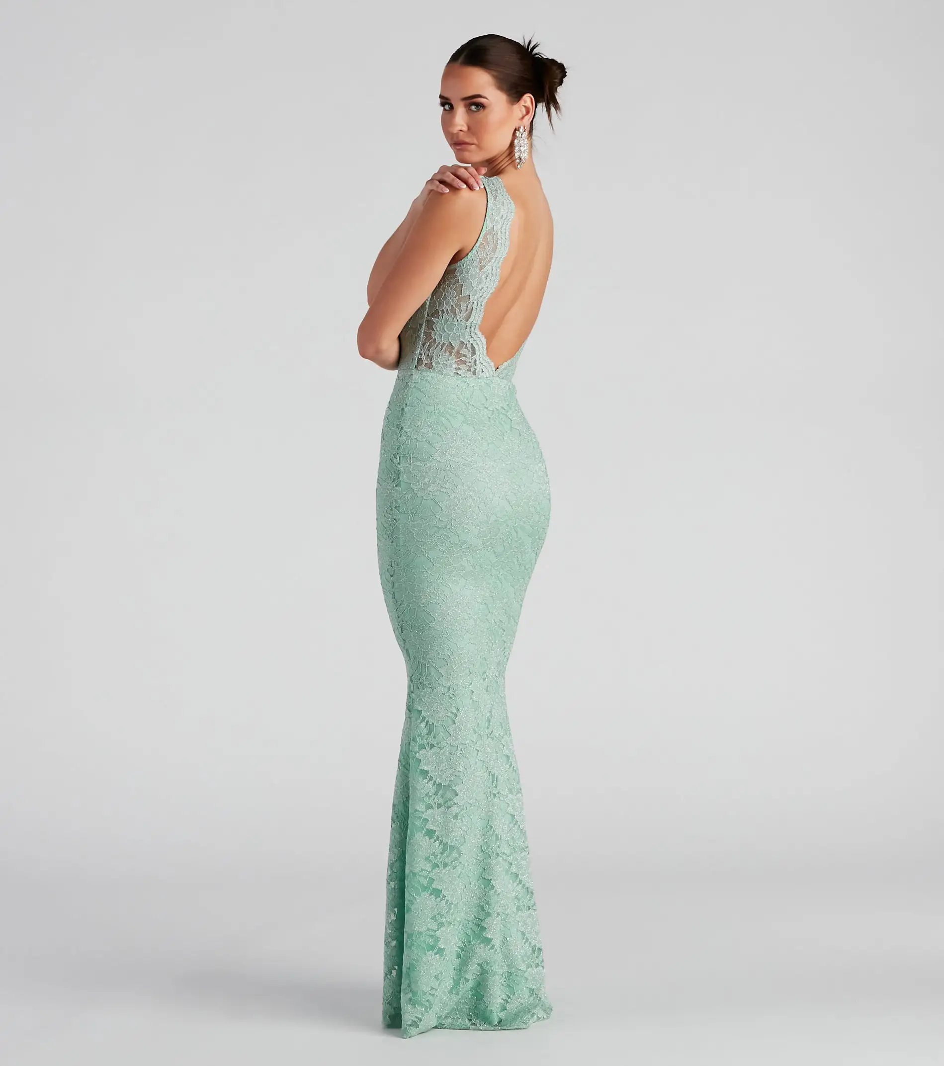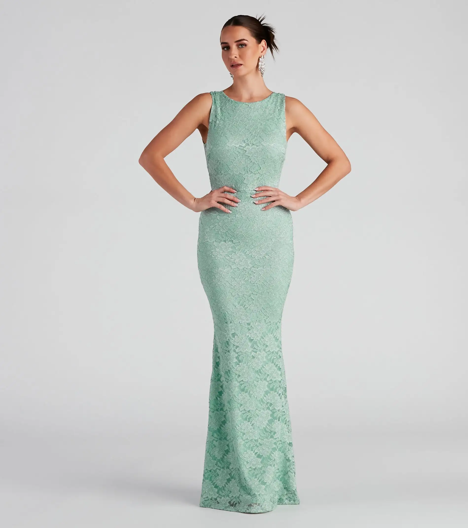 Showcase a gorgeous sparkle with each step in the Emery lace formal dress! She features a sleeveless boat neckline, tank shoulder straps leading to a chic open back design with scalloped lace detailing, a high waist seam, and a fitted floor-length silhouette. The lined lace fabric features all-over glitter for a pretty, picturesque vibe. Style the dress with