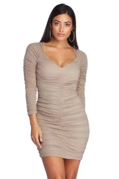 You deserve to feel confident and glam, and that’s exactly what our Emily natural mini dress will do! She features a V neckline, three-quarter sleeves, ruching to flatter every body type, and glitter to add that touch of sparkle. Dress is composed of a lined mesh fabric that offers a moderate stretch.