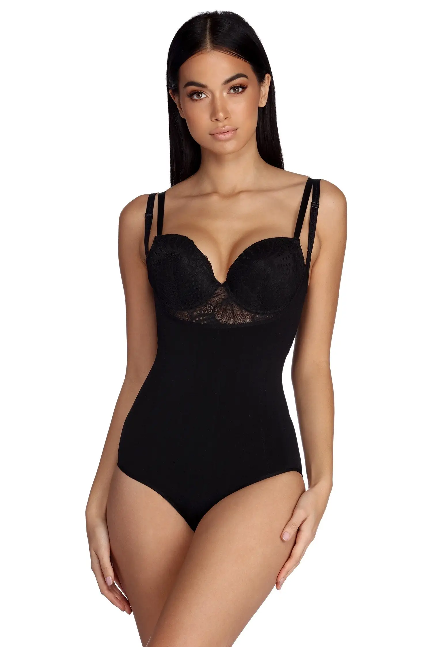 This essential black shaper bodysuit keeps your curves on point! They feature a deep scoop front, adjustable shoulder straps, and a full coverage bottom with a row of hook closures. Bodysuit offers a compression fit with minimal stretch.
