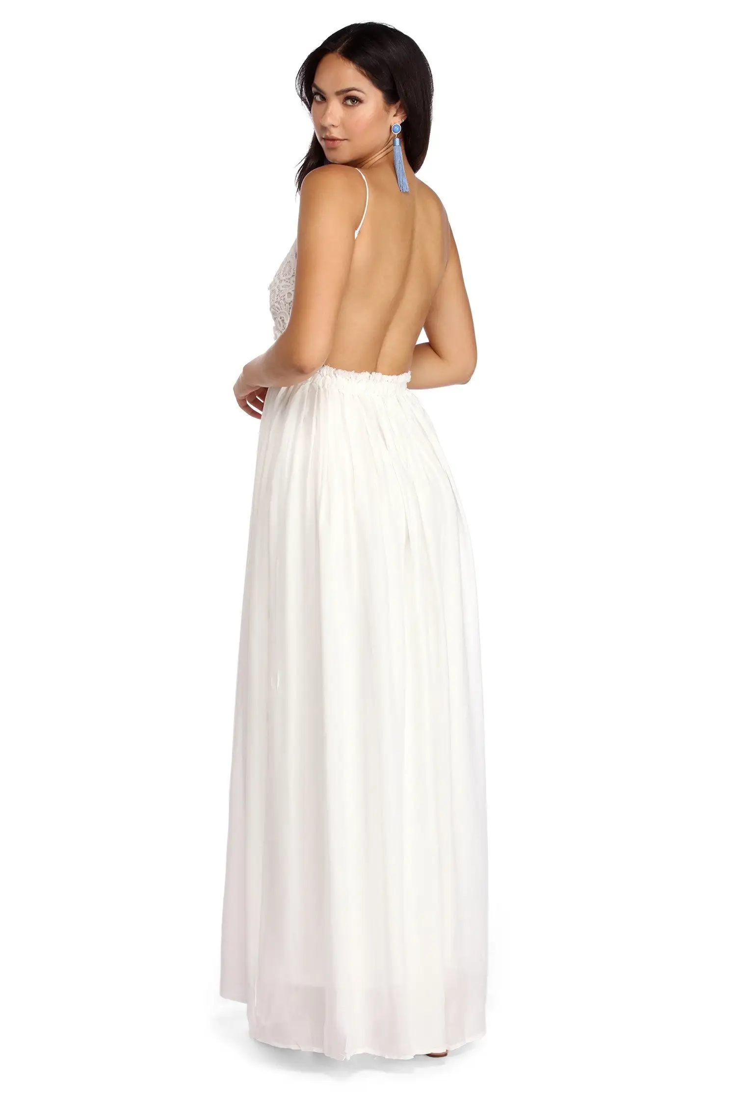 Be that trendy social butterfly at your next daytime event in this ethereal maxi dress! This backless trendsetter will be all the rage with a crochet bodice, adjustable narrow strap, and an elastic empire waist. Maxi skirt is a flowy A-line silhouette composed of a lightweight crinkled fabric. Dress is fully lined and offers minimal stretch.