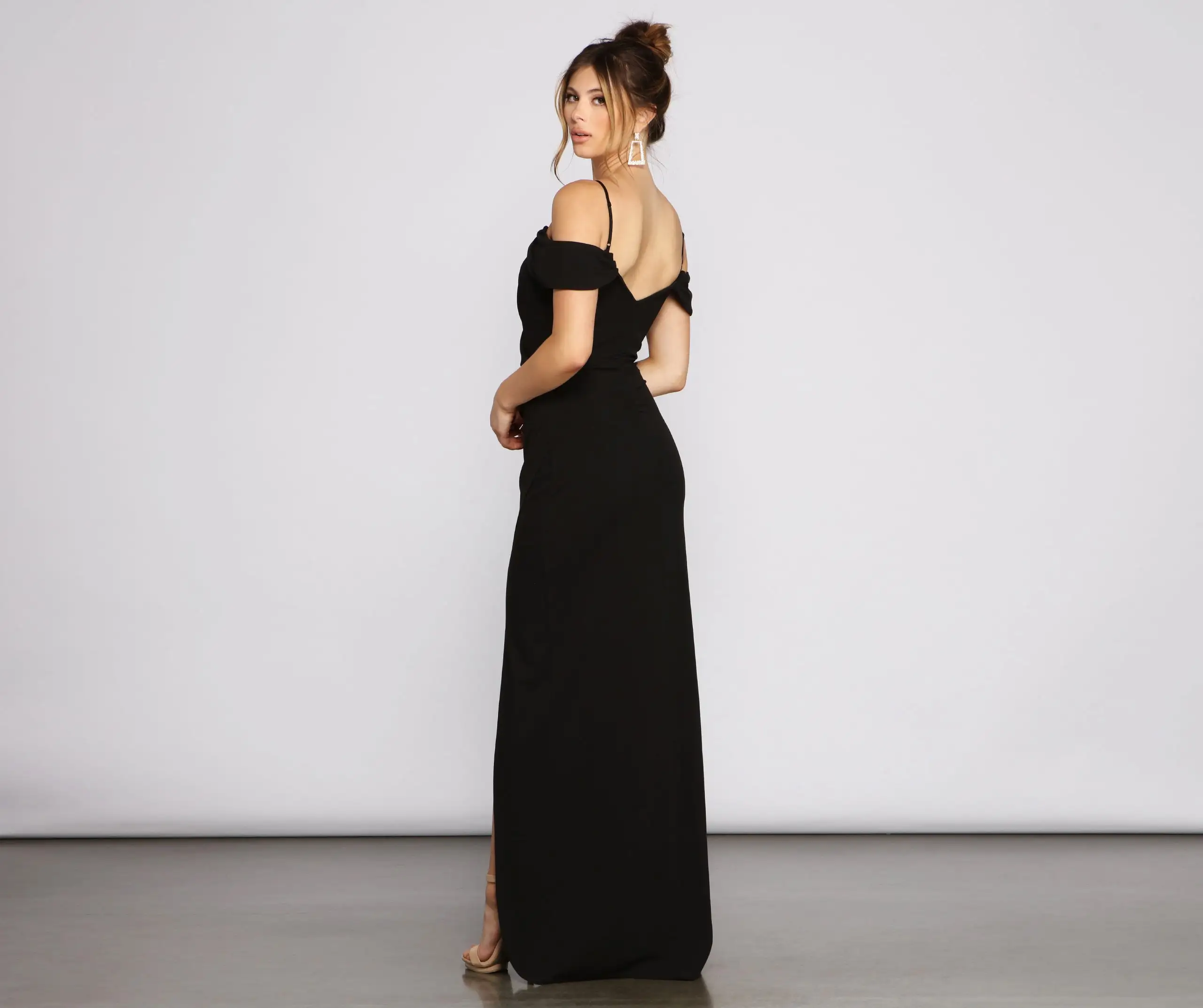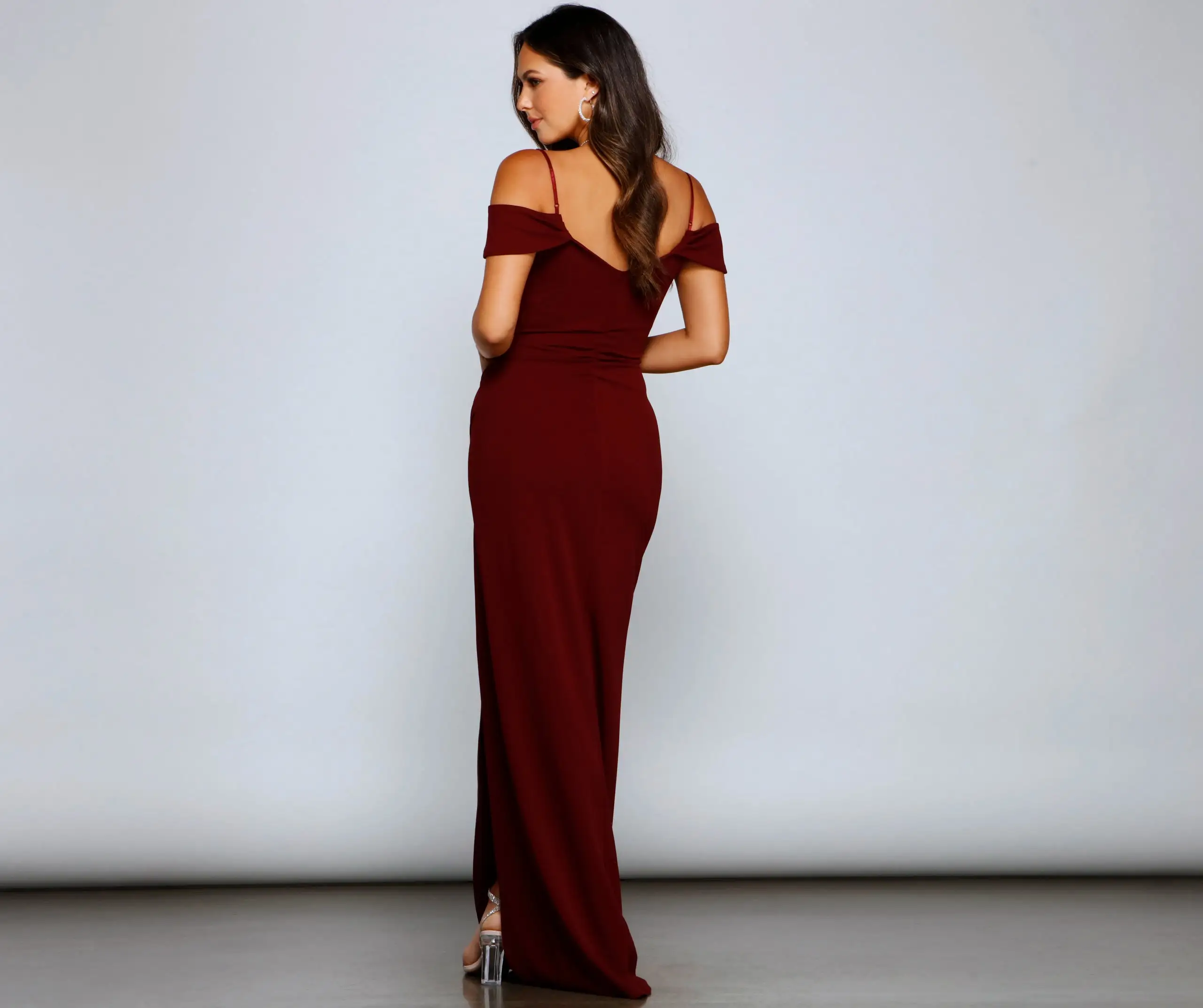 Step out in style this season in the stunningly gorgeous Eva formal dress! She features an off-the-shoulder V neckline with a pleated wrap-front, adjustable spaghetti straps, and a ruched back detail. Her high waist seam flows out to a floor-length A-line silhouette with an asymmetric wrap design creating a thigh-high slit. Complete your look with