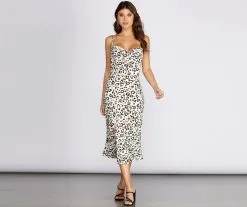 Get spotted in this sleek midi dress to make a fierce statement! It features sleeveless bodice, a cowl neckline, adjustable straps and a midi length silhouette. The all over leopard print is all you need to stay on trend. Dress is composed of a lined semi-sheer lightweight woven fabric that offers a relaxed fit with a minimal stretch. Includes a back zipper closure.
