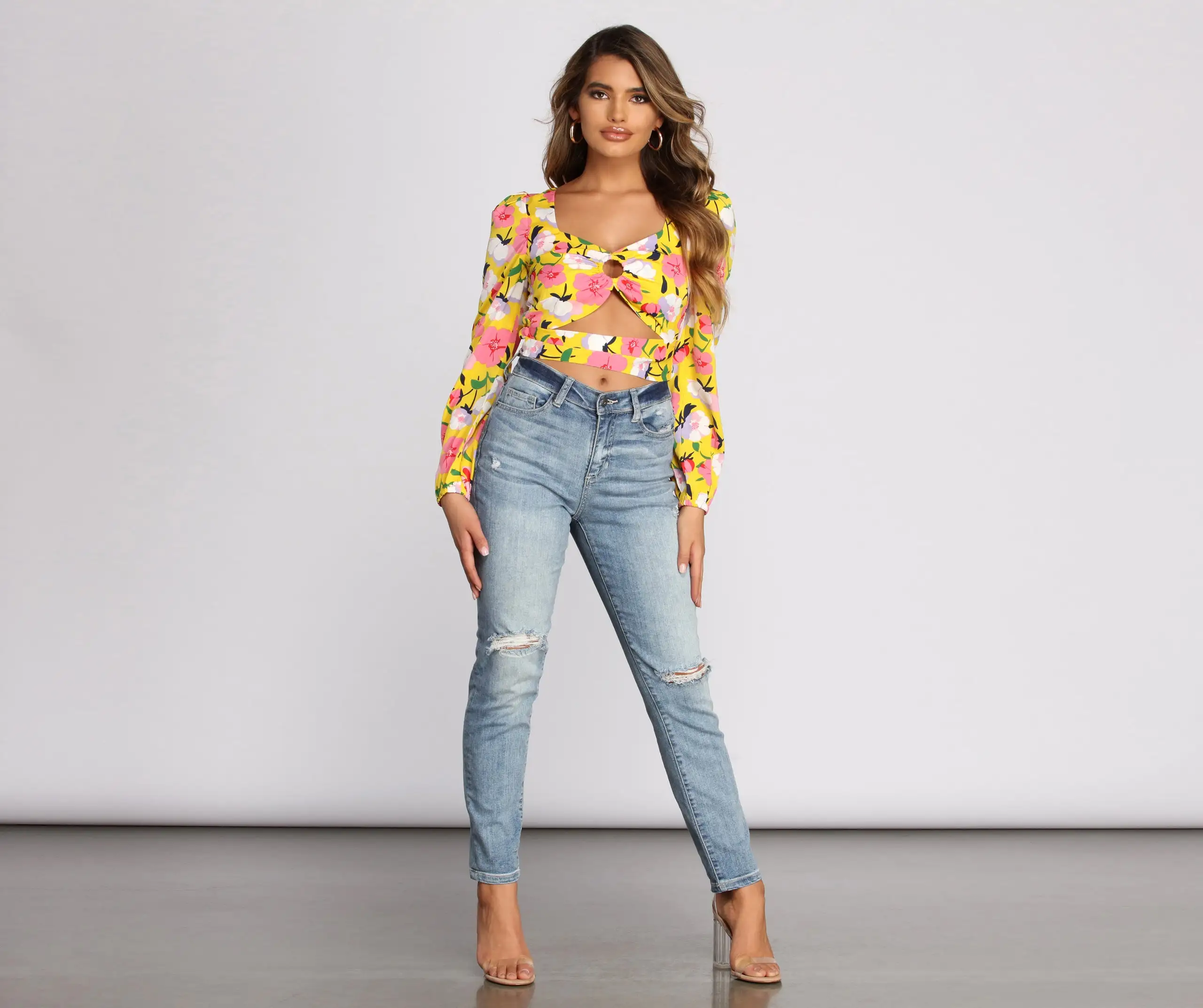Liven up your spring wardrobe with this flashy floral cut out crop top! Make it the star of your ‘fit with some basic denim and slide on mules.