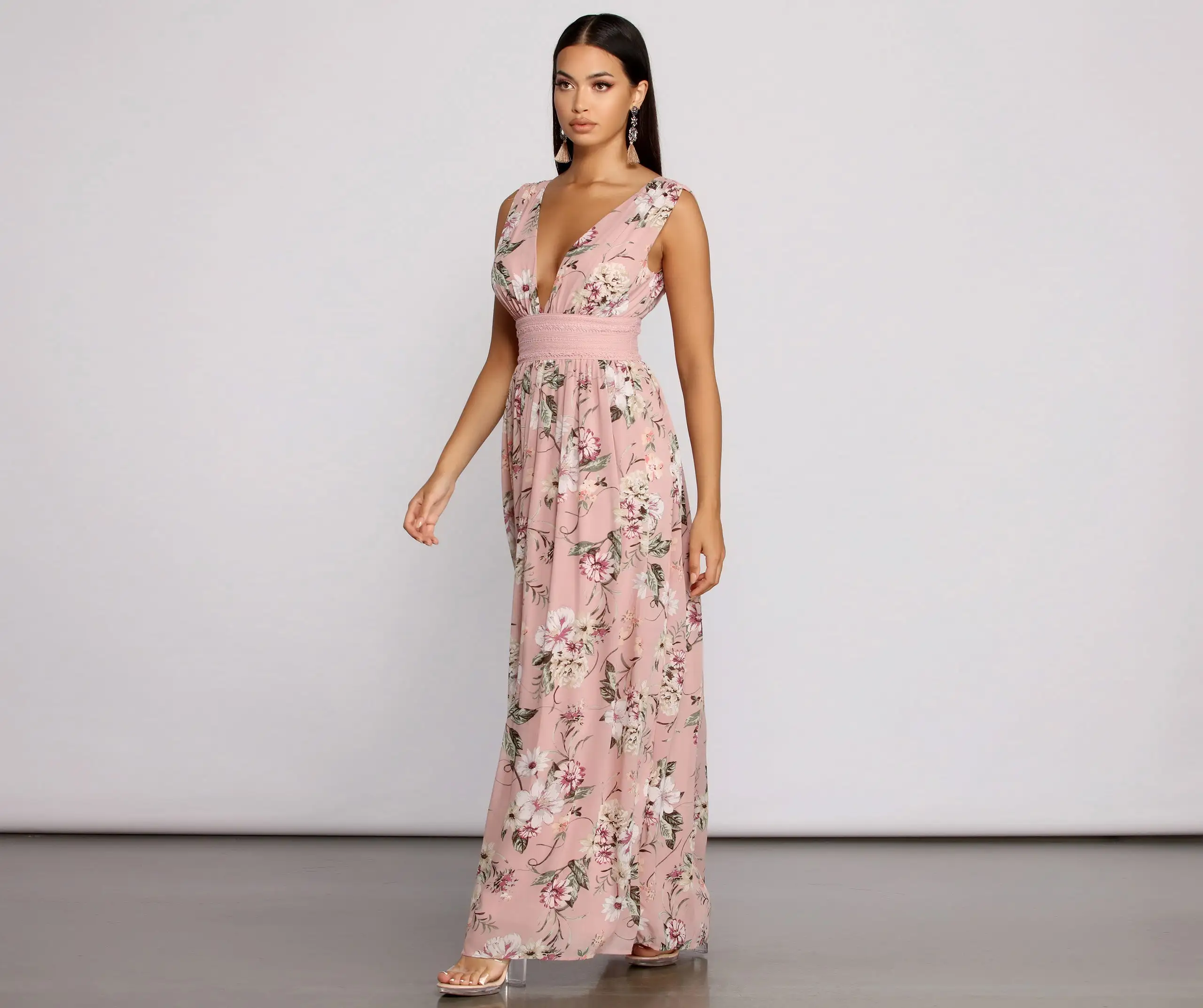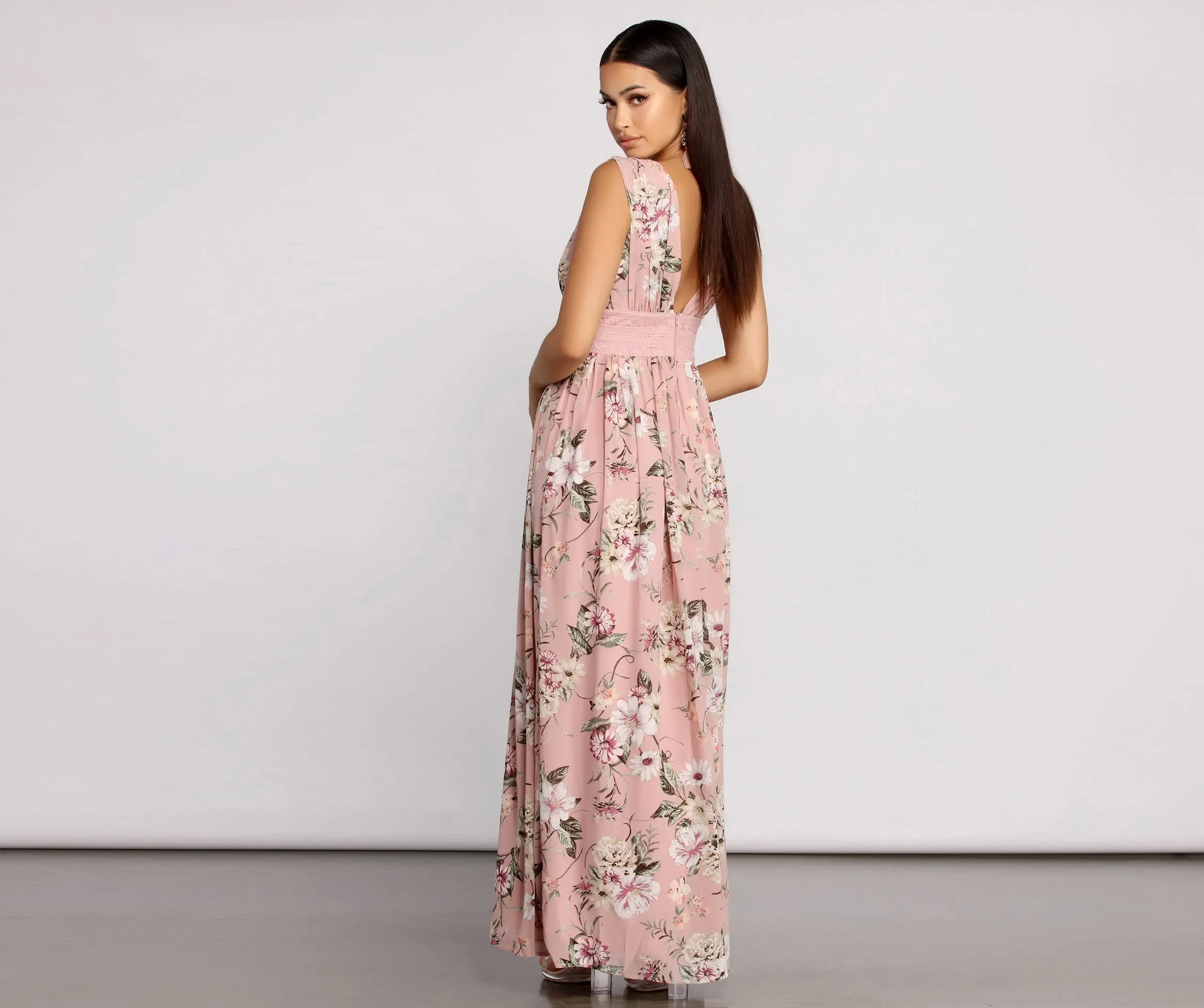 Radiate beauty in a floral maxi dress that brings the charm. Perfect for that next bridal shower this maxi dress features a sleeveless plunging v-neckline, a crochet lace detailed lace, and an all-over floral print. Complete your romantic outfit with