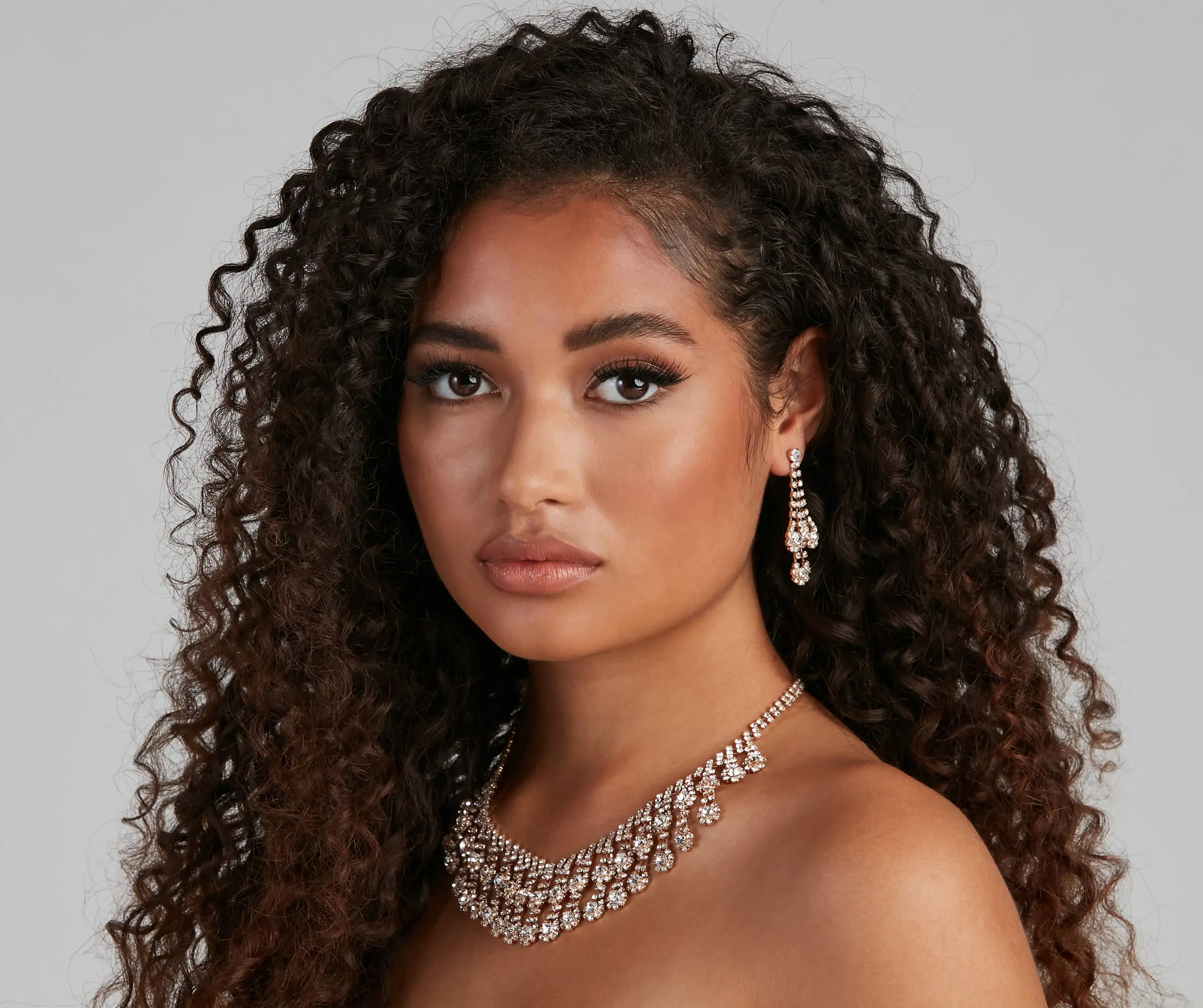 This necklace set is blooming in glam with a rhinestone flower-shaped fringe! The collar-style necklace has a lobster clasp closure and dangly earrings have a post-back closure. Complete your radiate look with a faux fur