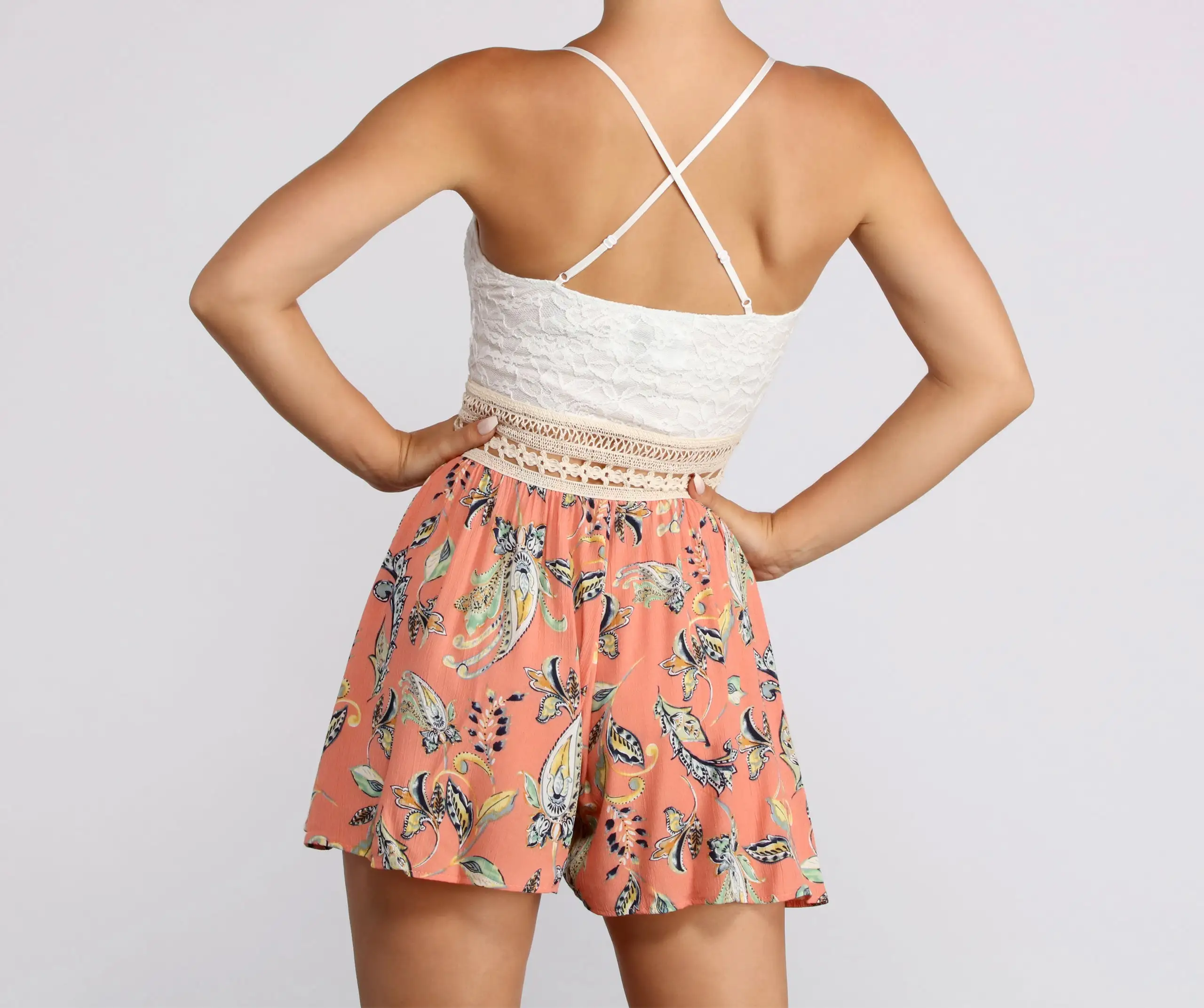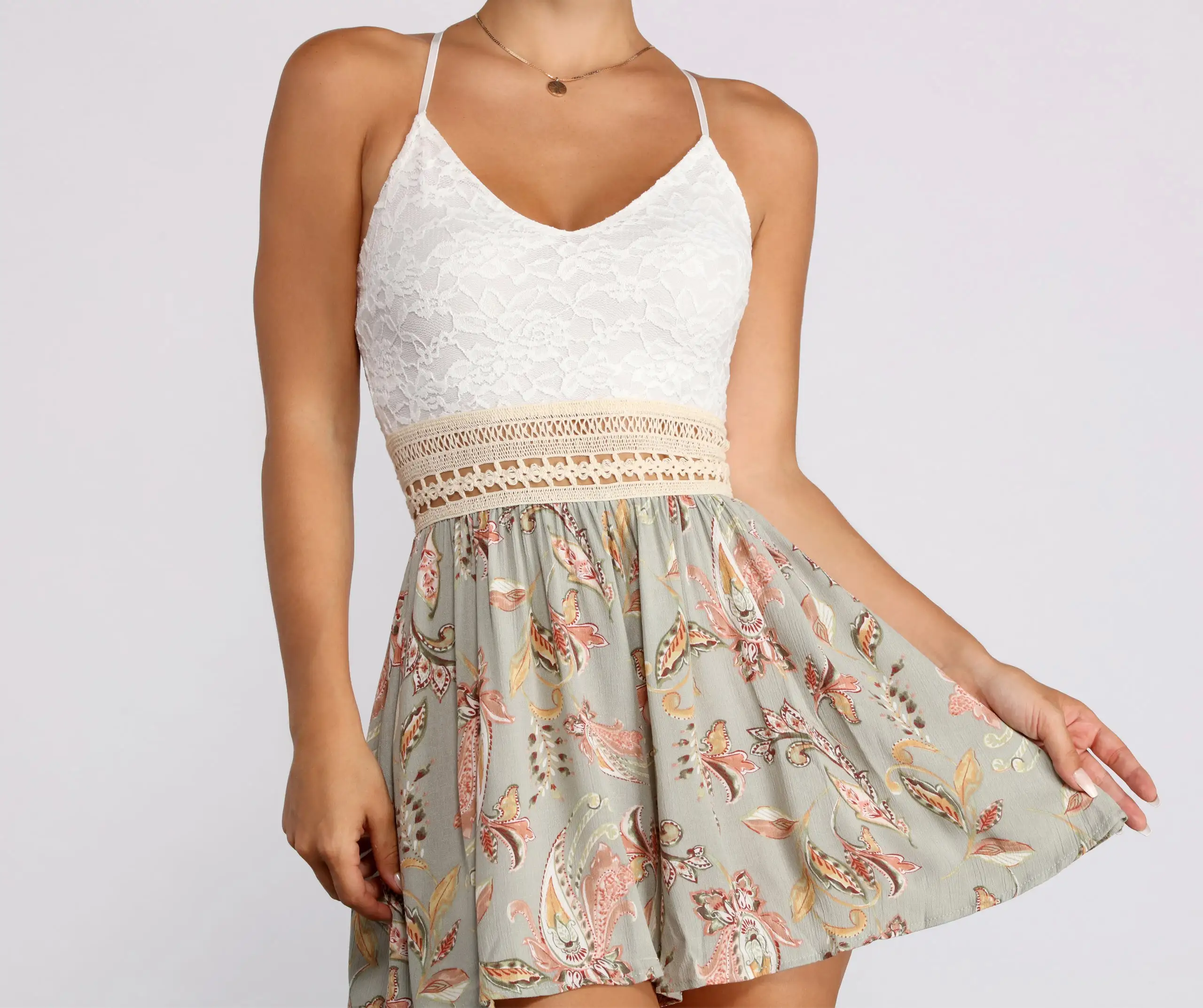 Gaze on at this cute pattern girl! Pair this season-ready romper with a pretty wedge and sleek hoops for a complete look!