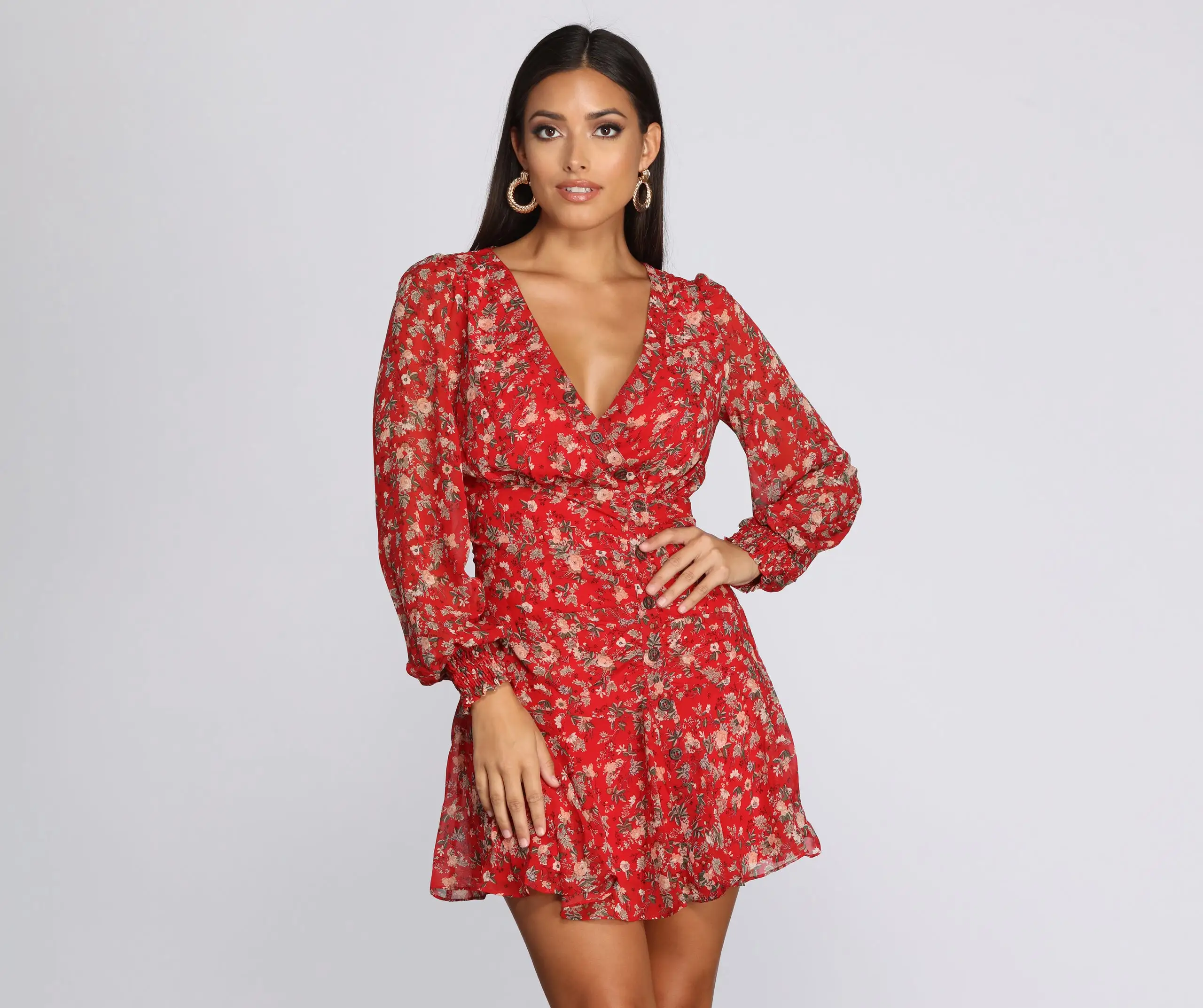 This flowy floral dress is the perfect piece to transition into fall! It features a wrap front V neckline, a hidden back zipper and hook and eye closure, long sleeves with smocked cuffs, a faux button down front, a high waist seam, ruched detailing, and a flirty ruffle hem. The printed dress is composed of a sheer chiffon fabric with a stretchy knit lining.