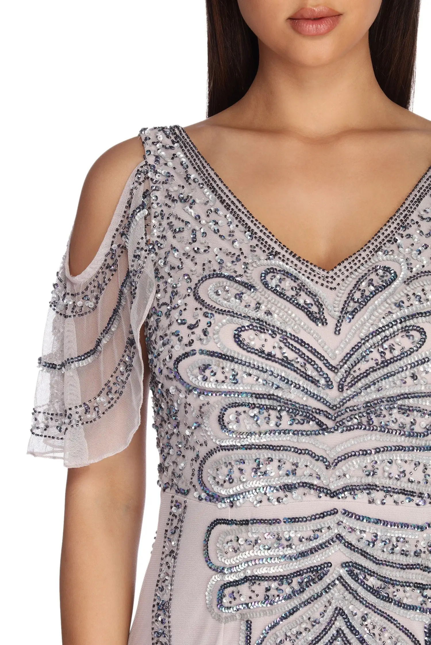 Bring the luxe in our breathtaking Francine gray dress! She features a V neckline, padded cups, sheer cold shoulder straps and tank-like straps. Her slim fit bodice is adorned with a Gatsby-inspired beaded design with shimmering sequins and leads to a sweeping floor length floor length silhouette with godet panels. Dress is composed of a sheer lined chiffon fabric that offers a relaxed fit with minimal stretch. Includes a hidden back zipper closure.