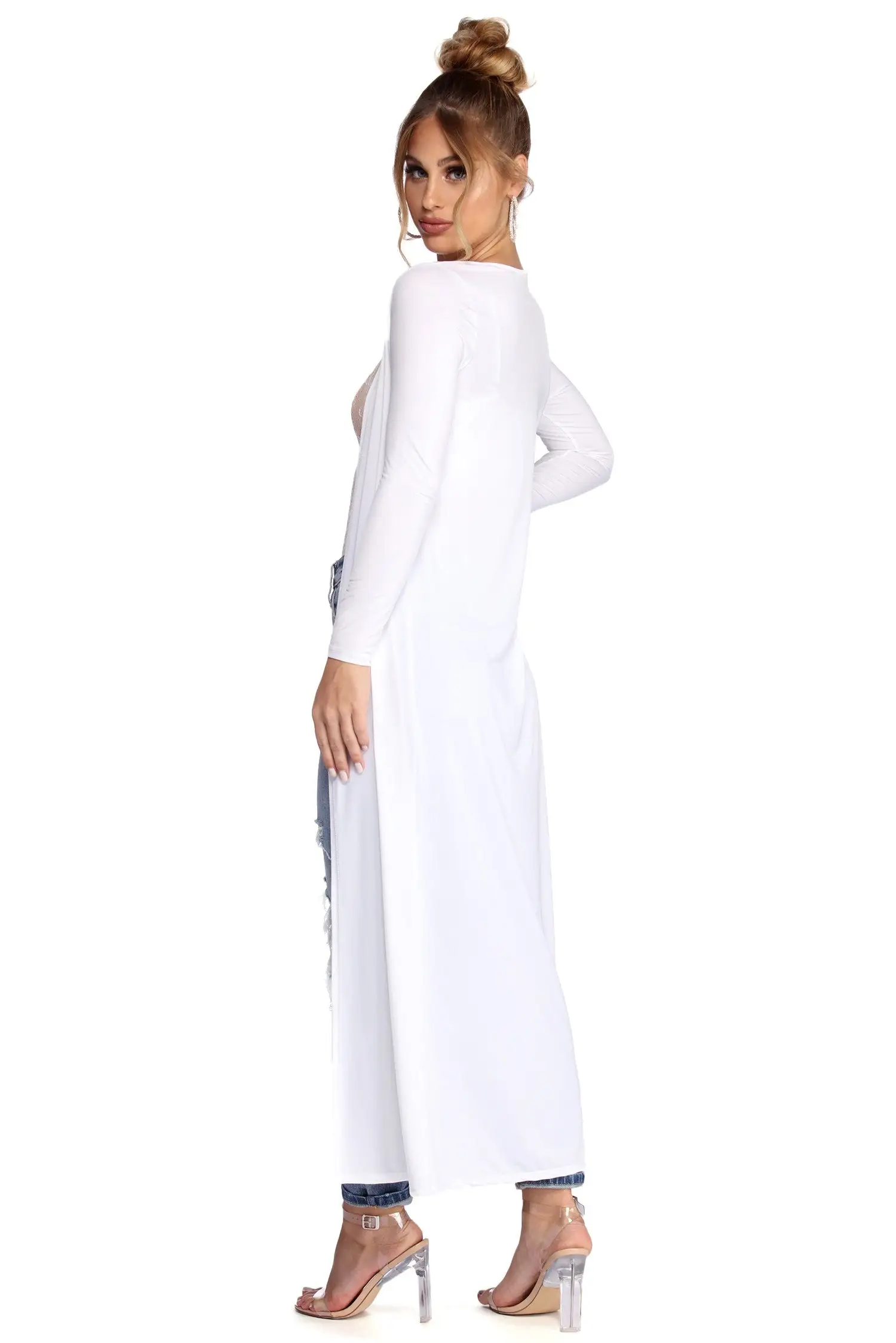Simple, fresh, and bright! This ivory knit duster features an open front, long fitted sleeves, and an extra long hem to add a chic look to your wardrobe! Duster is composed of a lightweight, smooth knit fabric.