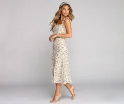 Keep it flirty and frilly in florals this season! This ivory dress features a sleeveless bodice, a square neckline, ruffled shoulder straps and a midi length skirt with side slit. The all over dainty floral print features blue hues. Dress is composed of a linen fabric.