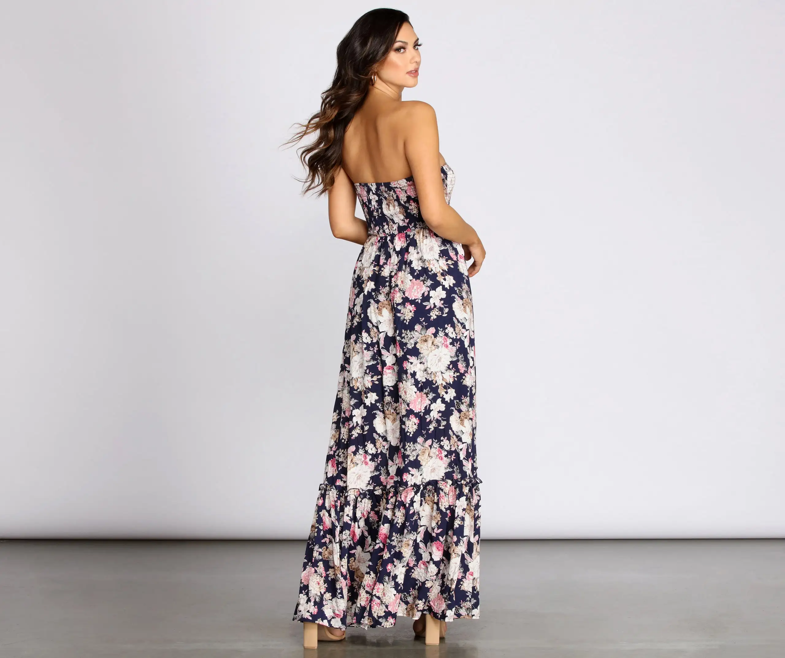 Girl, you’ll look stunning on your weekend getaway in this floral tube maxi dress! It features a strapless square neckline, a smocked bodice, and a flowy maxi-length silhouette with a ruffle bottom hem. Don’t forget to add a pair of wedges and a