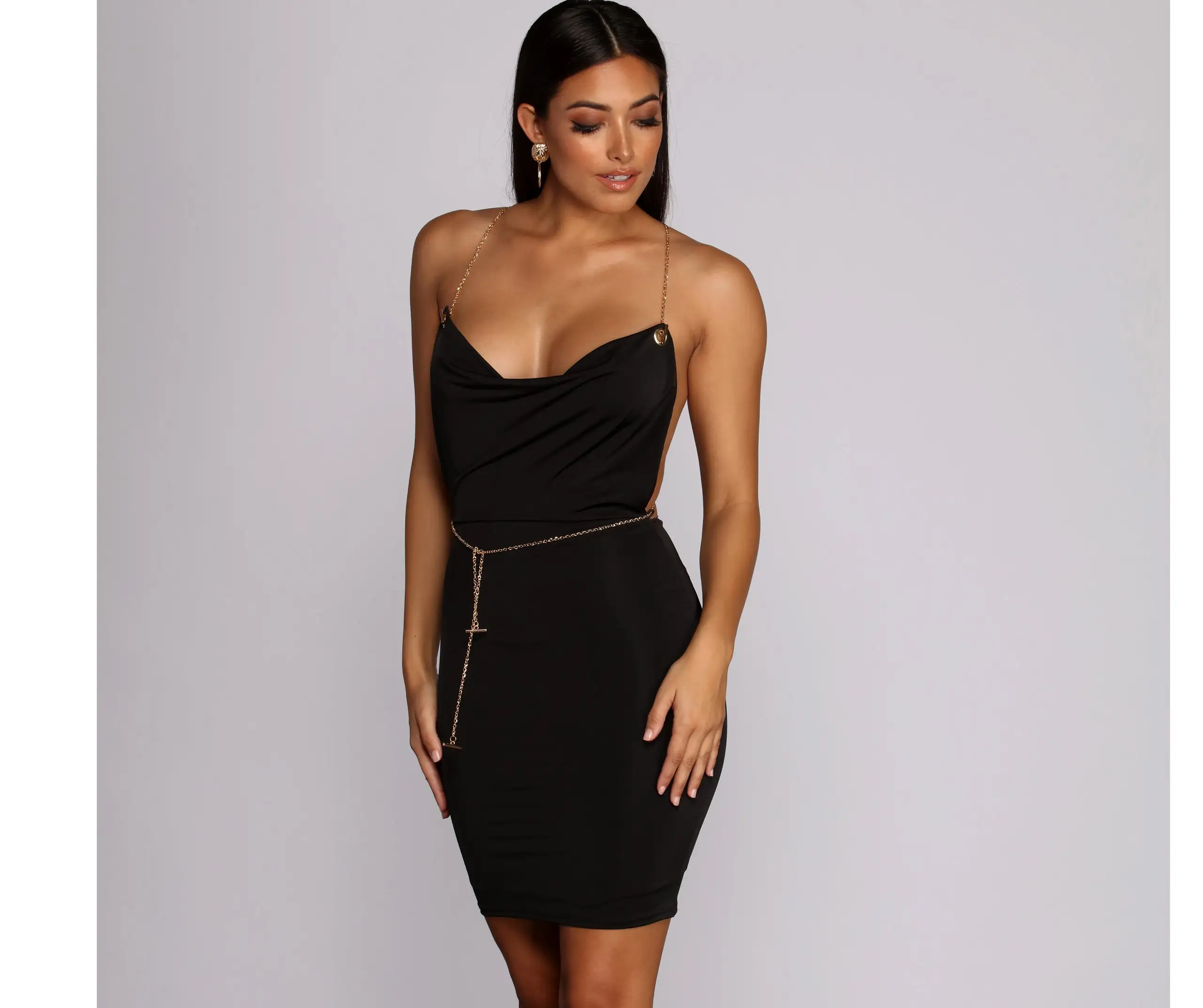 Show us your sexy side with this sleek dress! This sexy number is sleeveless with chain spaghetti straps, they cross in the back and meet around the front to double as a belt accessory. The dress offers a cowl style neckline and an open back, it also has a smooth inner lining. The material is a smooth knit that offers minimal stretch.