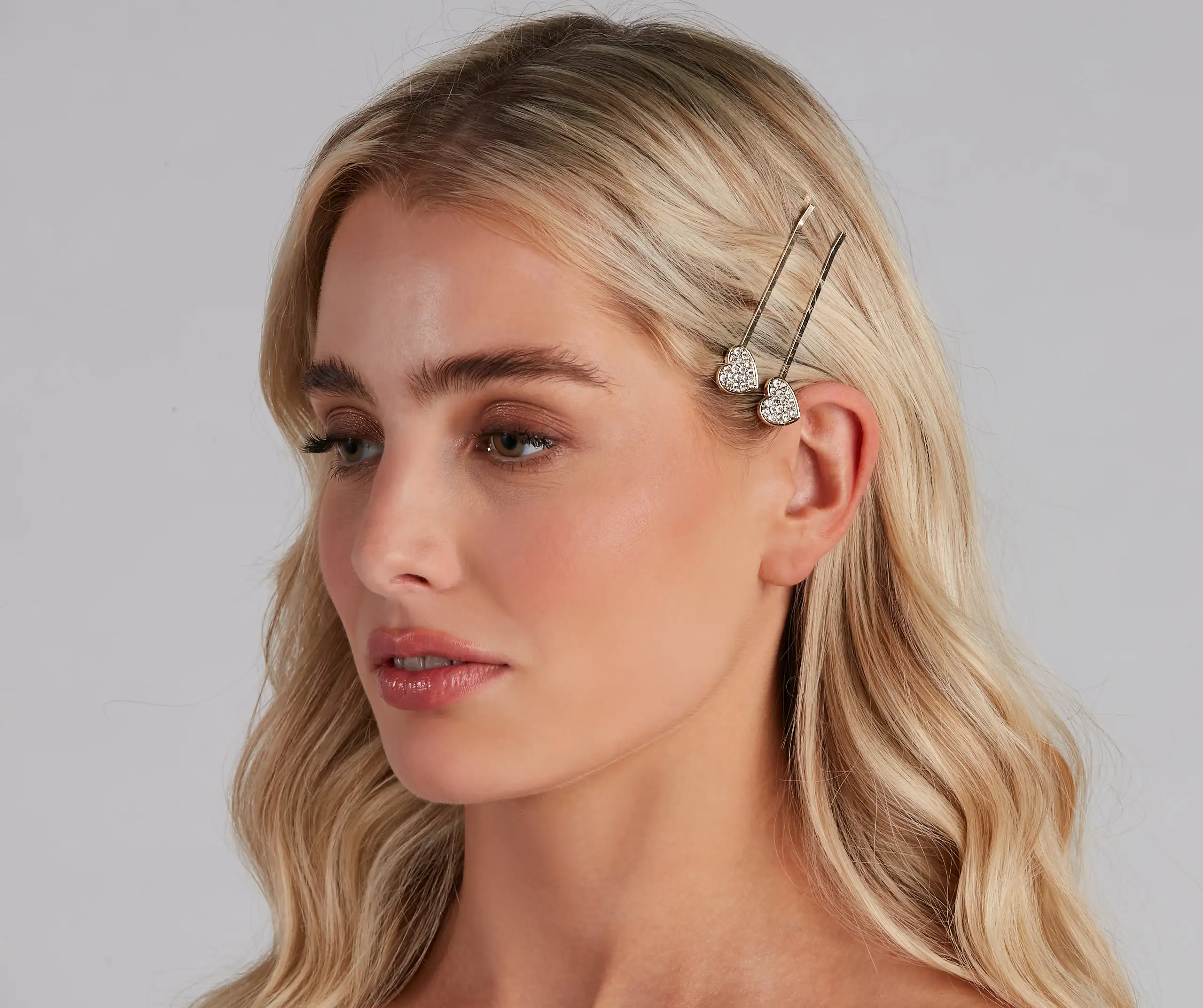 Showcase your glam status in this rhinestone bobby pin set featuring two heart pins and three bar-shaped pins. Complete the look in matching rhinestone