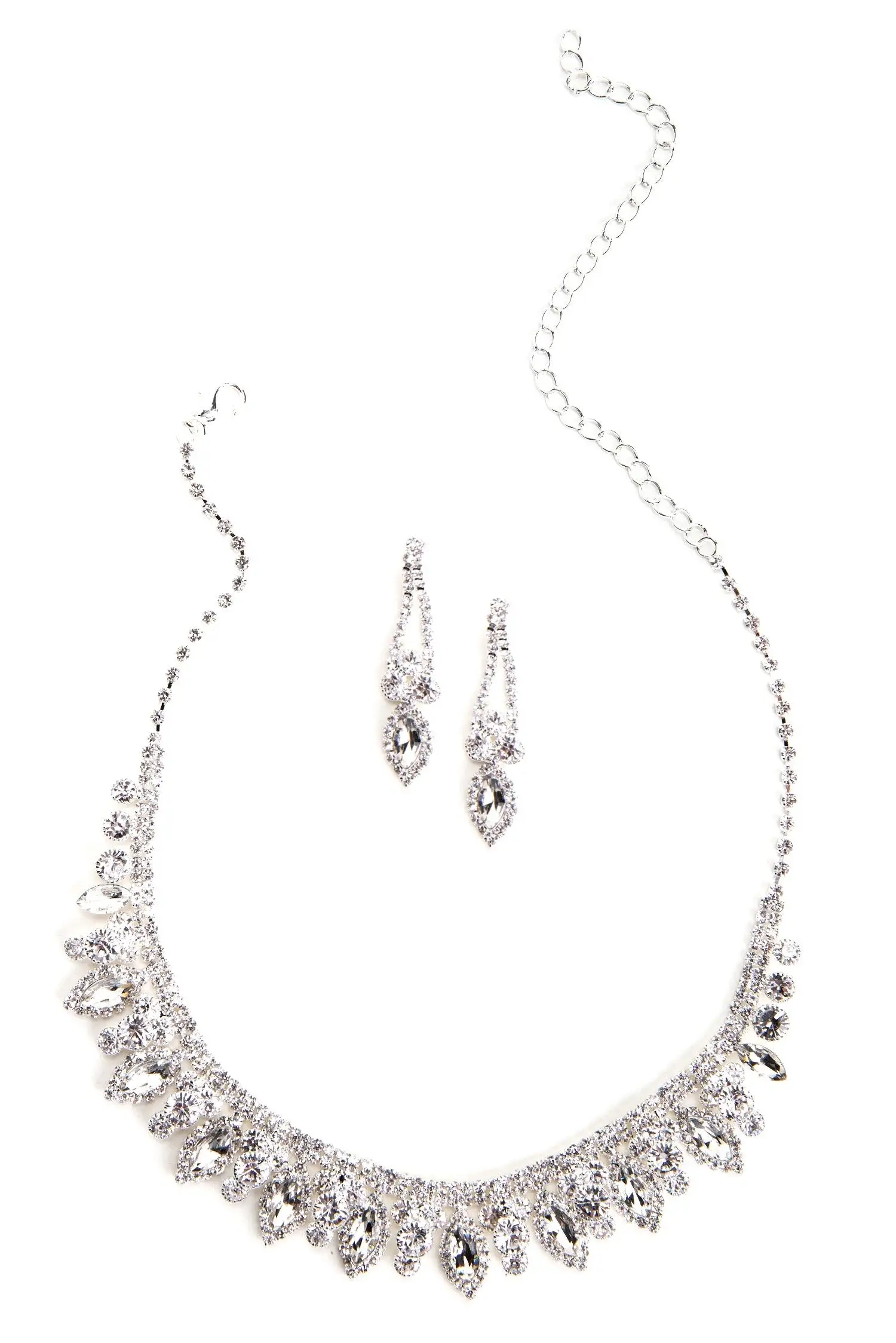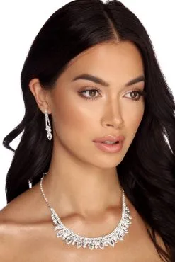 Bring glamour to the evening with this gorgeous silver necklace and earring set. They feature a tear drop rhinestone design with lots of beautiful shine! Necklace includes a lobster clasp closure. Earrings include post back closure.