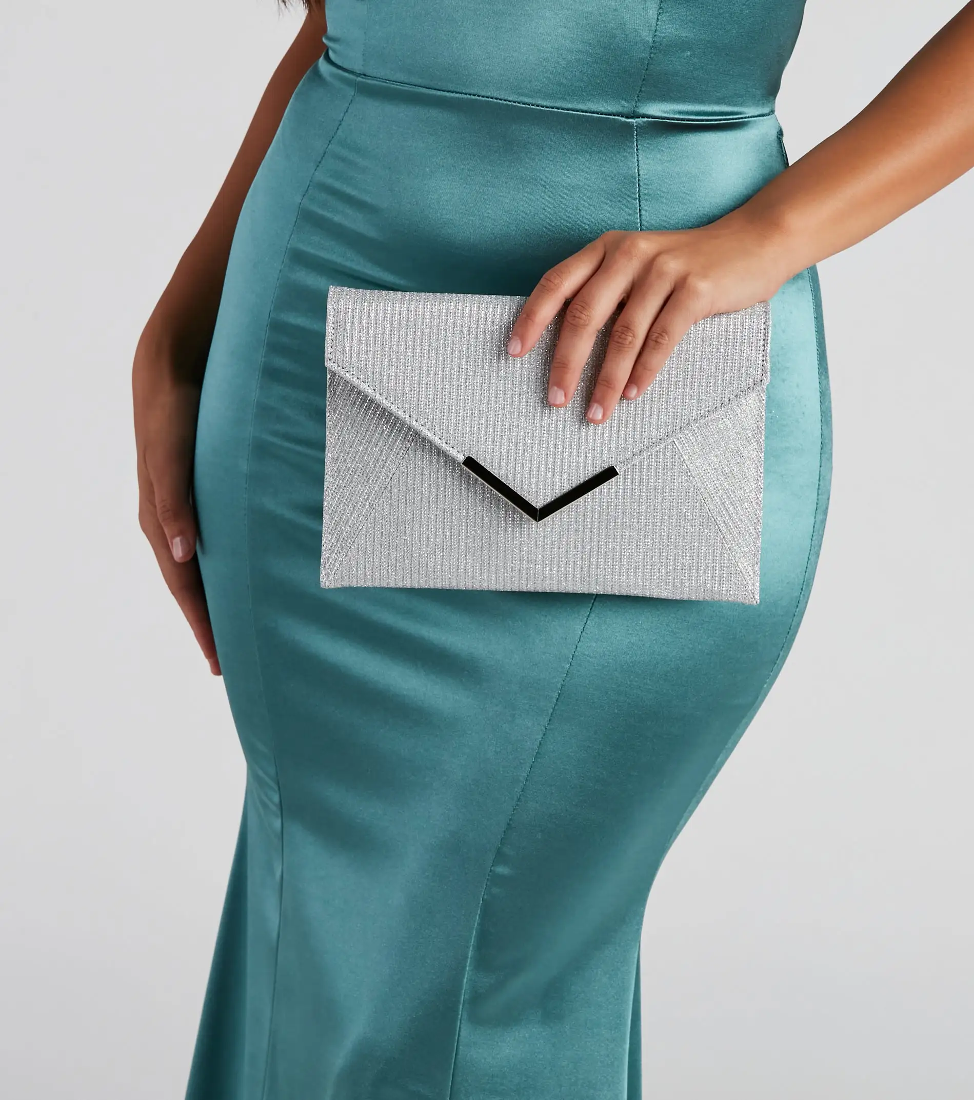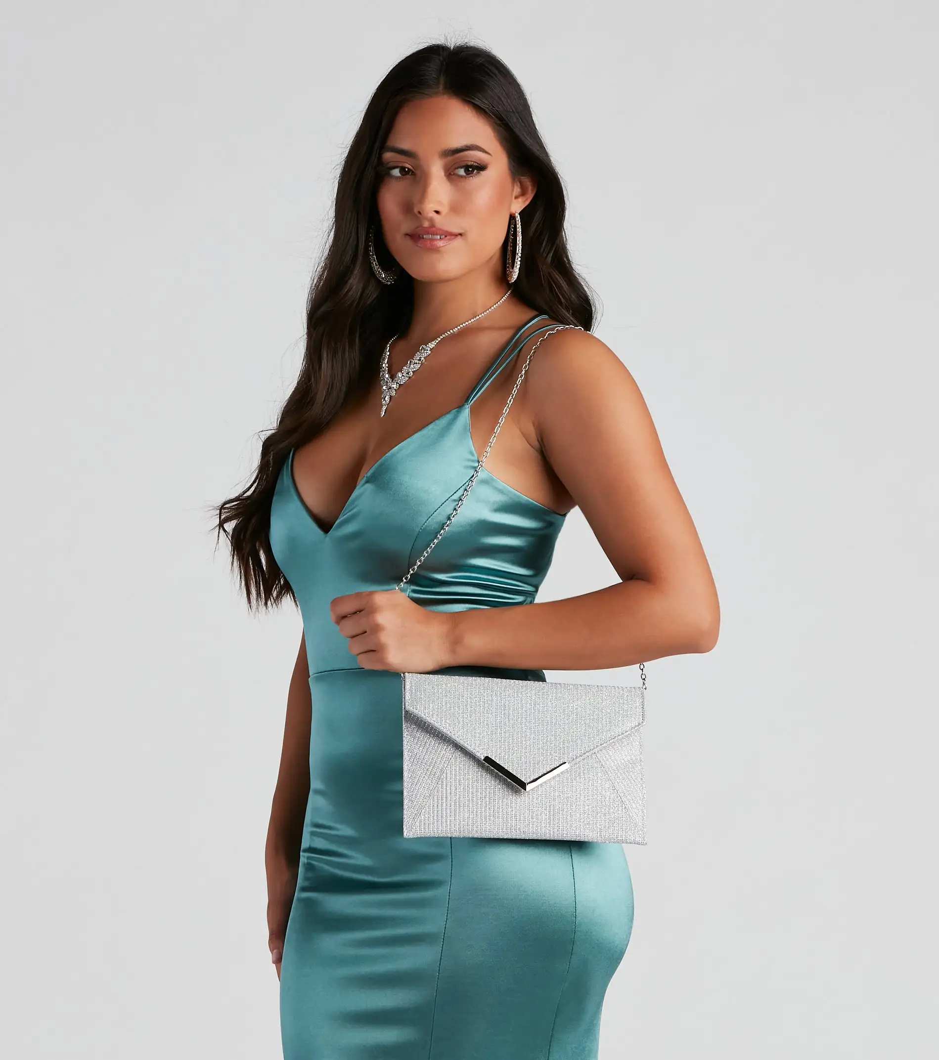 Leave a trail of shine with this glitter mesh envelope clutch featuring a detachable chain-link strap, snap-button flap closure, and a satin interior with a pocket. Complete your formal look with a sparkly