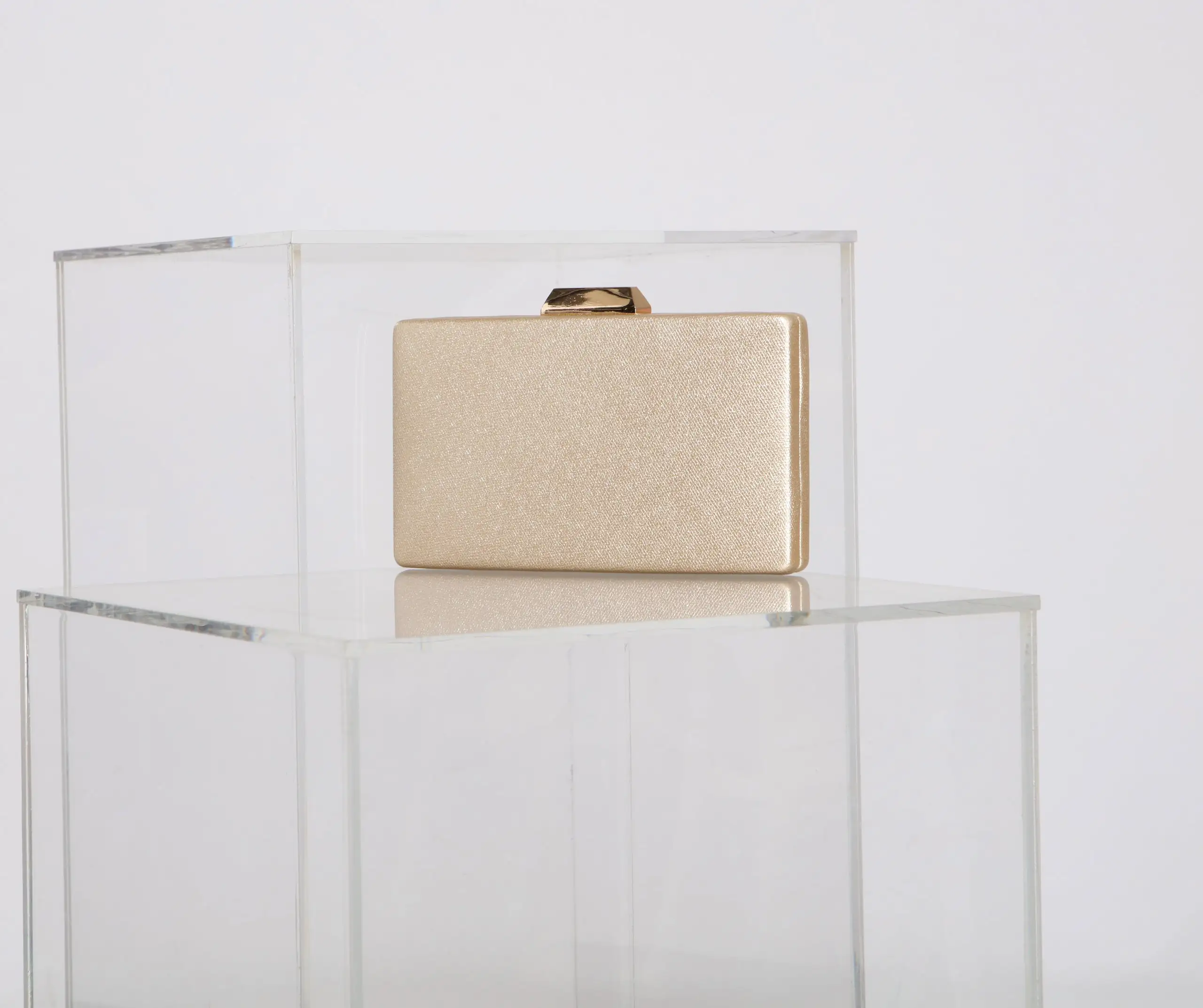 Showcase your elegance with a box clutch to keep all essentials in! The clutch features a rectangular body, top fasten closure, glitter body, and a detachable chain shoulder strap. Complete look with a