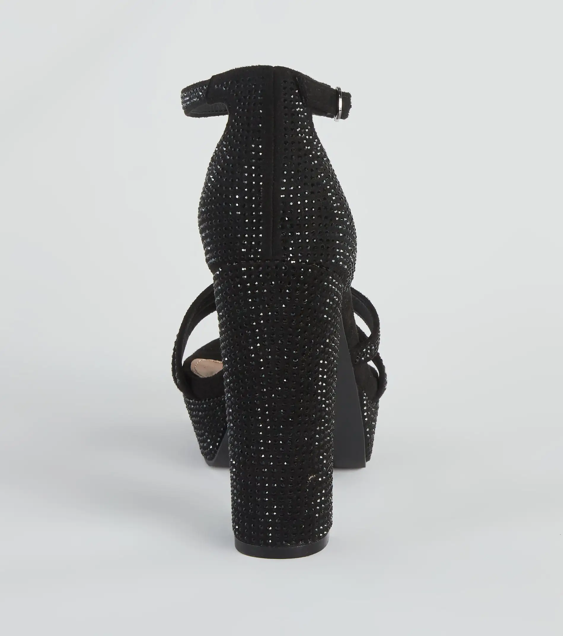Reach a glitz and glam status with these rhinestone platform heels featuring an almond toe, dual top straps, a closed ankle, block heel, and an ankle strap with buckle closure on faux suede material. Complete the look in a sassy