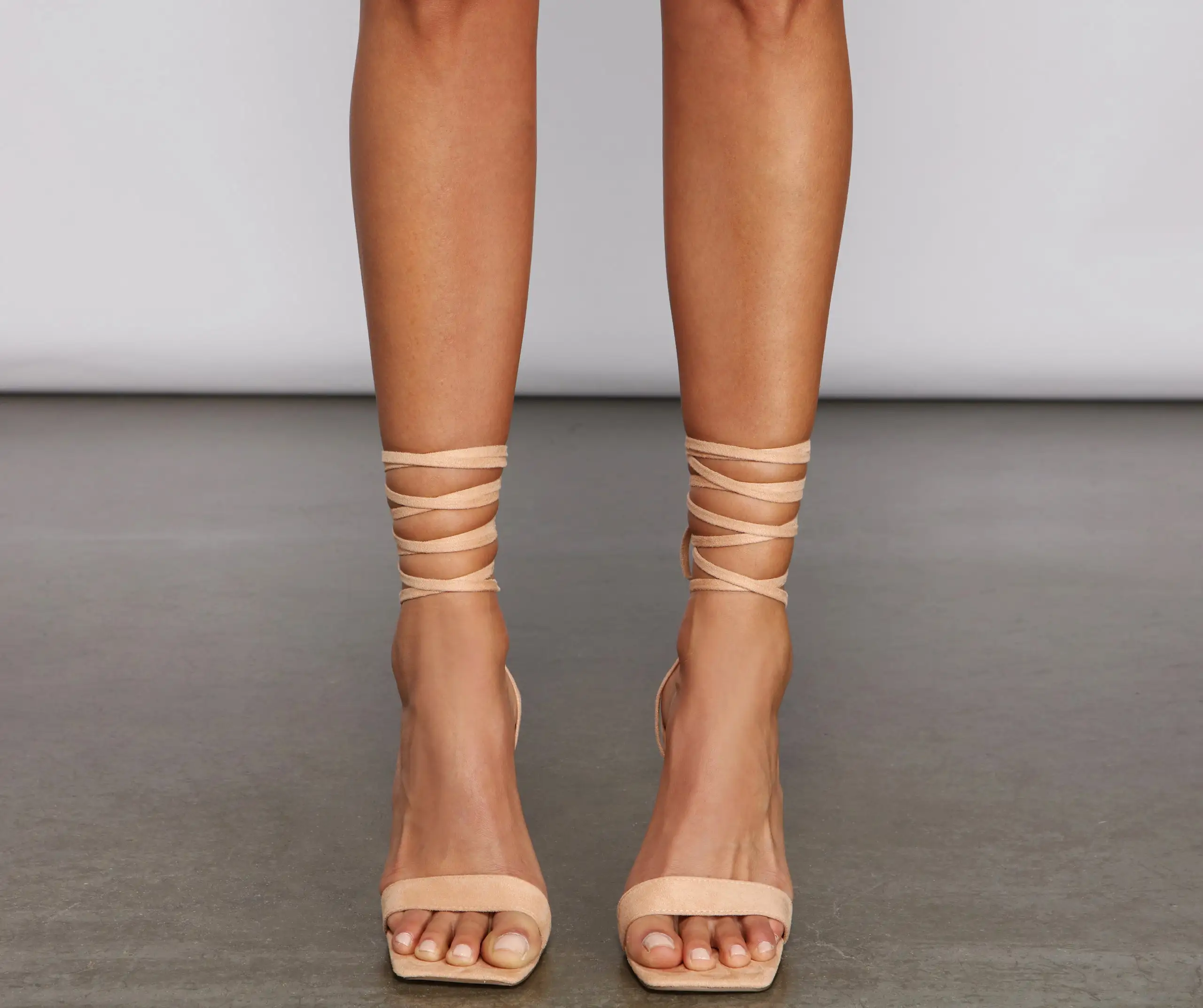 Chase that glow with heels that sparkle up your night! The heels feature lace-up straps, an open square toe with a single strap over the toe, and a rhinestone embellished stiletto heel. Complete look with an