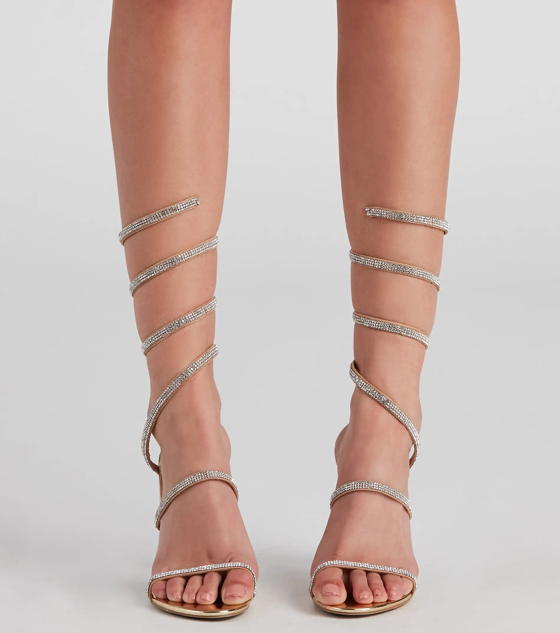 Let your glow shine through in these eye-catching stiletto heels featuring a rhinestone embellished spiral design, pointed toe, on a chrome sole. Complete your look in a