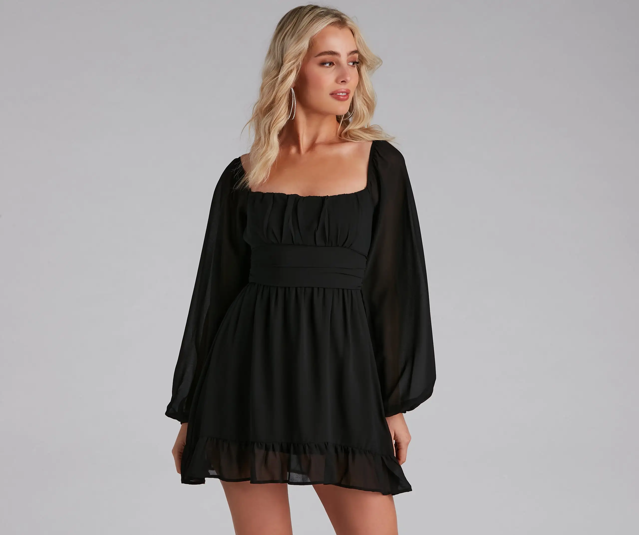 Go with the flow and keep it casual with a dress that can be dressed up or down for a date with bae. The dress features a square neckline, long balloon sleeves, an empire waist with pleating, and a skater length silhouette with a ruffled hem. The dress is composed of a lined chiffon fabric that offers a form hugging fit with minimal stretch. Complete look with block heels and