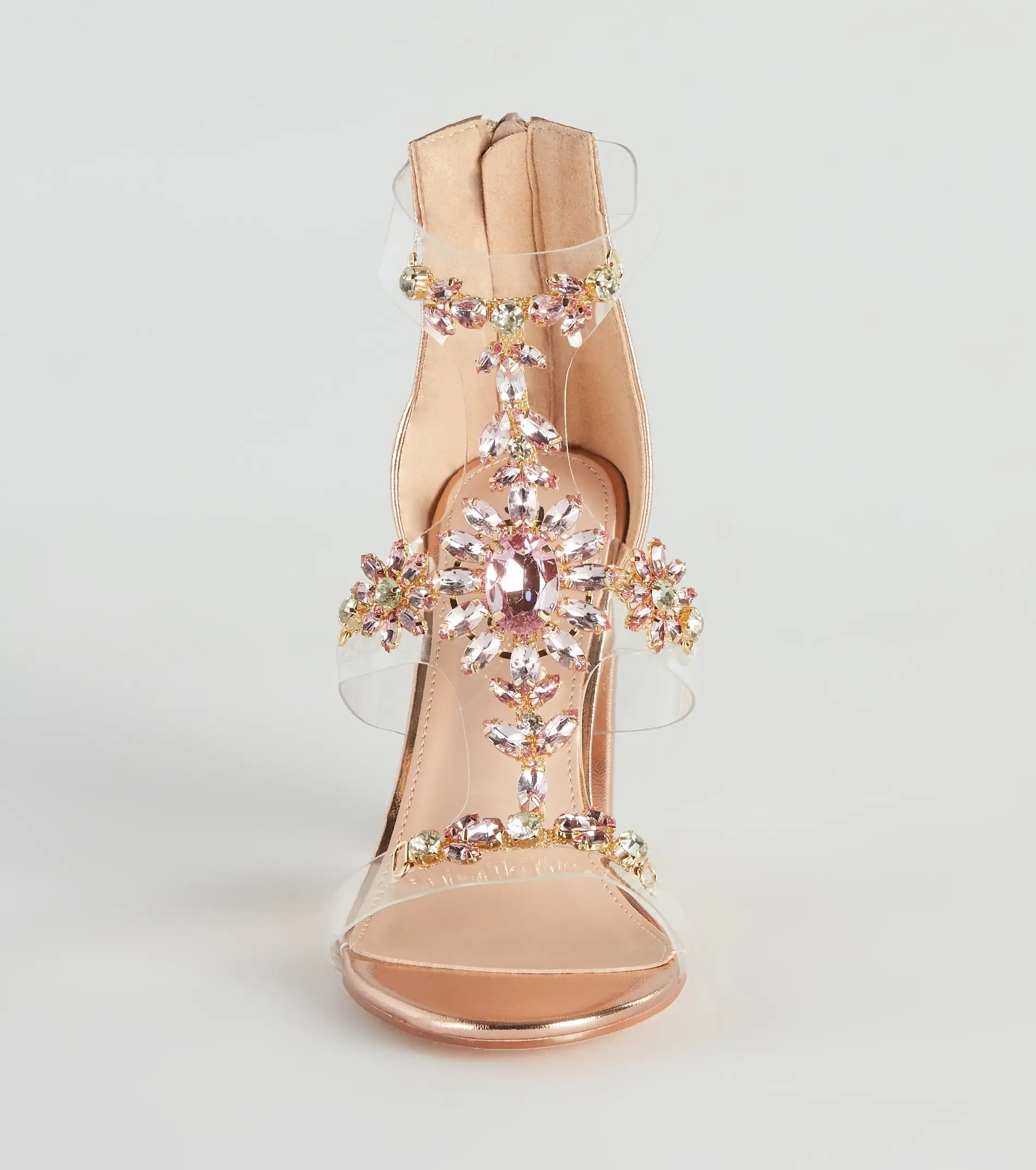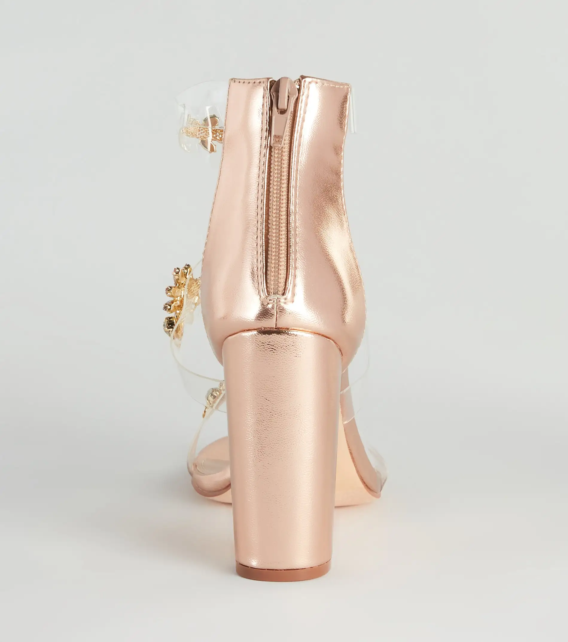 Enchant them all when you step into the room in these gorgeous glam gemstone metallic heels. They feature an open almond toe, clear PVC straps with cutout detailing, sparkling chunky gemstone accents in an intricate floral design, a back zipper closure, a block heel, and a fabulous metallic sheen. Style with a