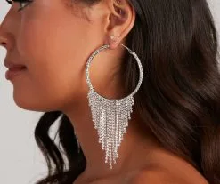 Showcase gorgeous radiance with these embellished statement earrings that bring the glamour. They feature a large hoop design with mini rhinestone embellishment and cascading rhinestone fringe. Style these earrings with a