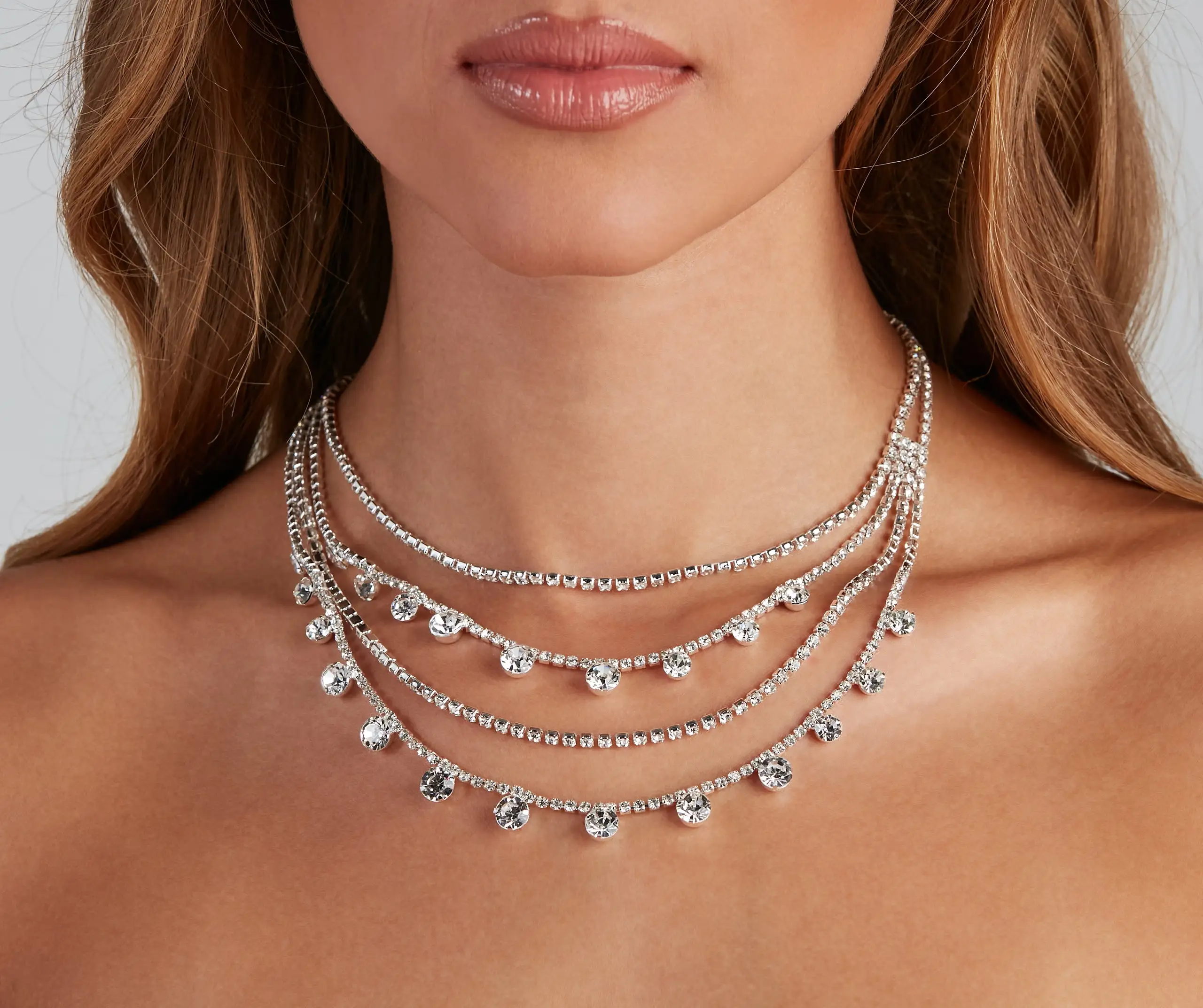Showcase a gorgeous sparkle with this embellished statement necklace. It features four cascading layers with mini rhinestone embellishment, two of the layers with a round rhinestone drop design. Style this necklace with a glitzy
