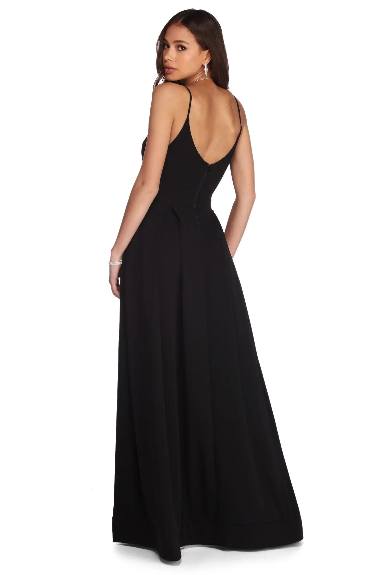 Reveal the goddess that you are in our ethereal and elegant Grace ball gown! She features an all over black hue, a sleeveless bodice, a V neckline paired with narrow straps leading to a V back and a eye catching sheer mesh inset. Her bodice features flattering princess seams throughout to provide structure, and lead to an empire waist detail. Her waist leads to a playfully pleated ball gown skirt with hidden side pockets and a wide banded hemline. She is composed of a crepe fabric that offers a natural fit with moderate stretch. Includes knit lining and back zipper closure.Â