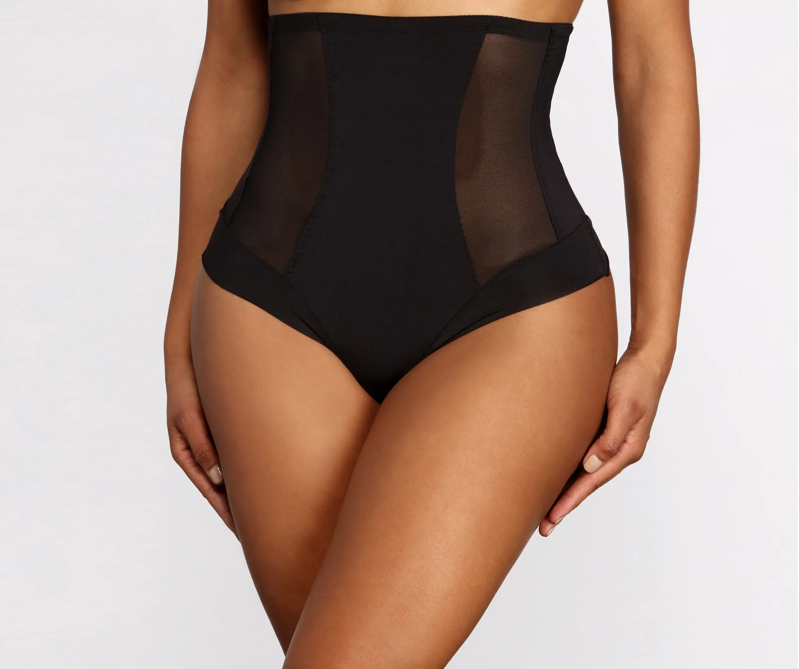 Get a sleek and seamless look under your formal silhouette! This black hued high waist shaper features a built in no slip strip, sheer mesh insets in front and a thong bottom. Shaper is composed of a smooth nylon fabric that offers a form hugging fit with a moderate stretch.