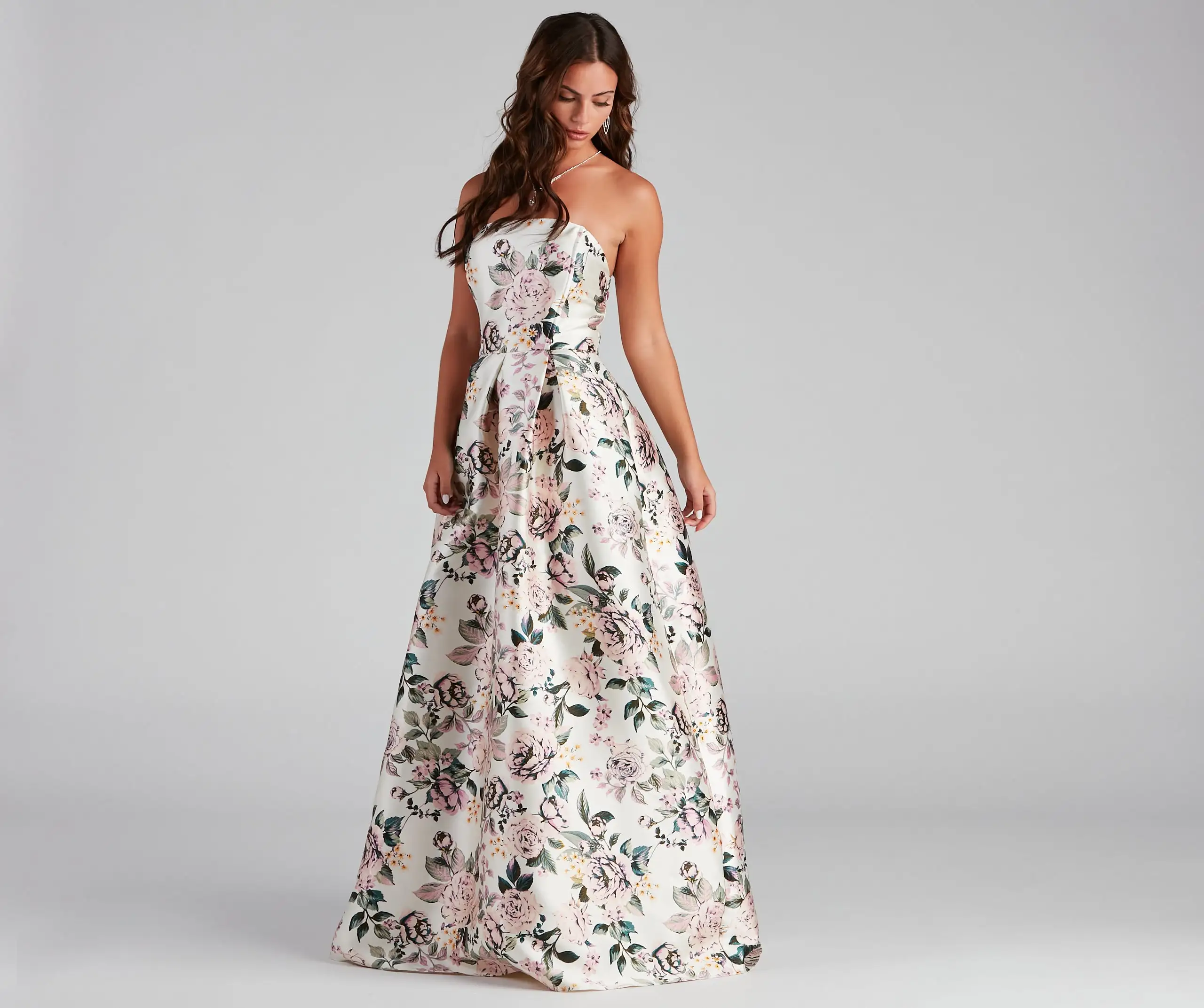 Arrive at prom with a prom ball gown that brings the charm to your enchanted evening! Holland features a lovely floral print, a sleeveless square neckline, supportive padded cups, flexible boning that provides structure, and a gel no-slip strip. Add additional support to her bodice by adding the removable adjustable spaghetti straps. Her high waist leads to a voluminous ball gown with pleated detailing and hidden side pockets. She is composed of a lined woven satin fabric that offers a flowy fit with minimal stretch. Complete your prom outfit with single strap prom shoes and a