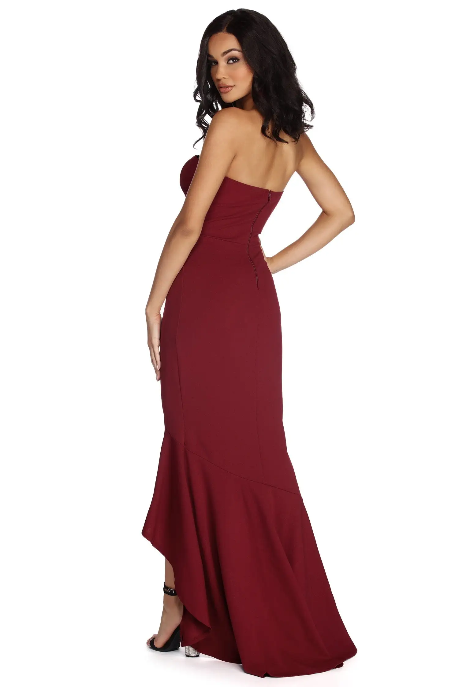 Fun and sexy! Our Hollie dress is the perfect way to get your next formal event outing! She features a strapless neckline with a sweetheart bust and a mermaid silhouette with a high-low hem. Includes a back zipper. She is composed of a lined crepe fabric that offers a form hugging fit with a moderate stretch.