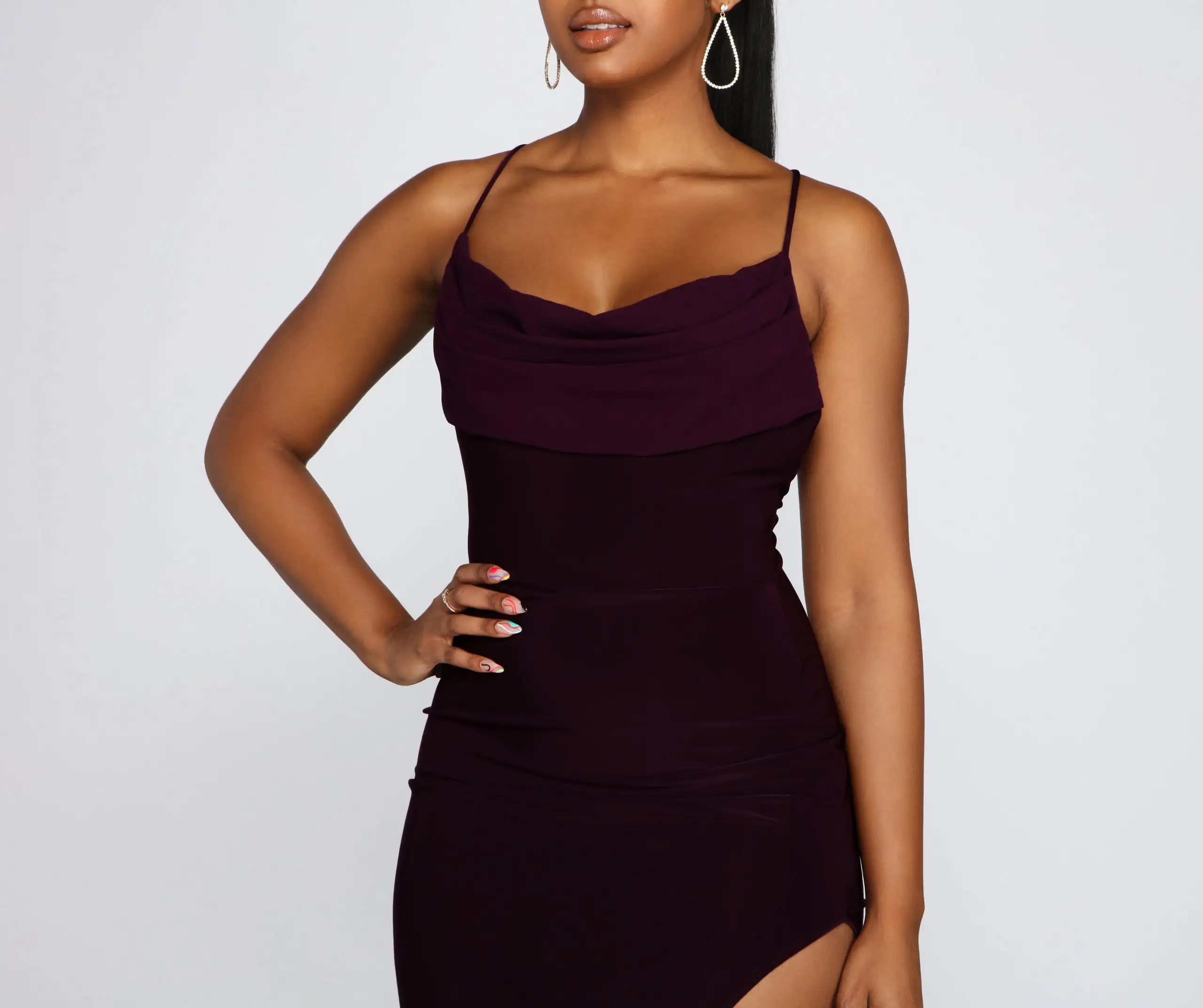 Make your mark with a captivating formal dress that brings the sophistication! Inez features a sleeveless cowl neckline, adjustable spaghetti straps that cross at the back, a ruched side seam, and a high side slit. The dress is composed of a smooth knit fabric that offers a form hugging fit with a moderate stretch. Complete look with