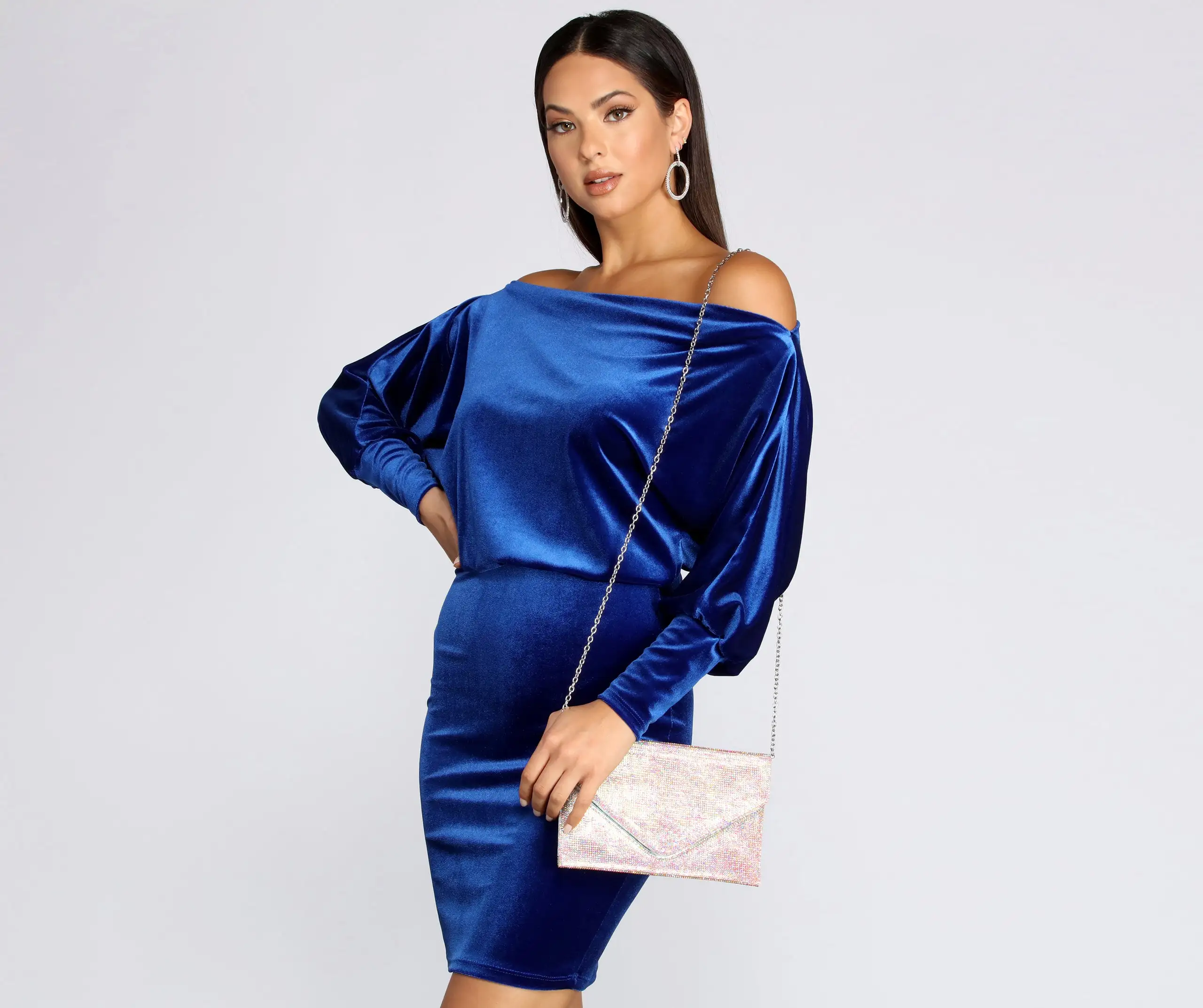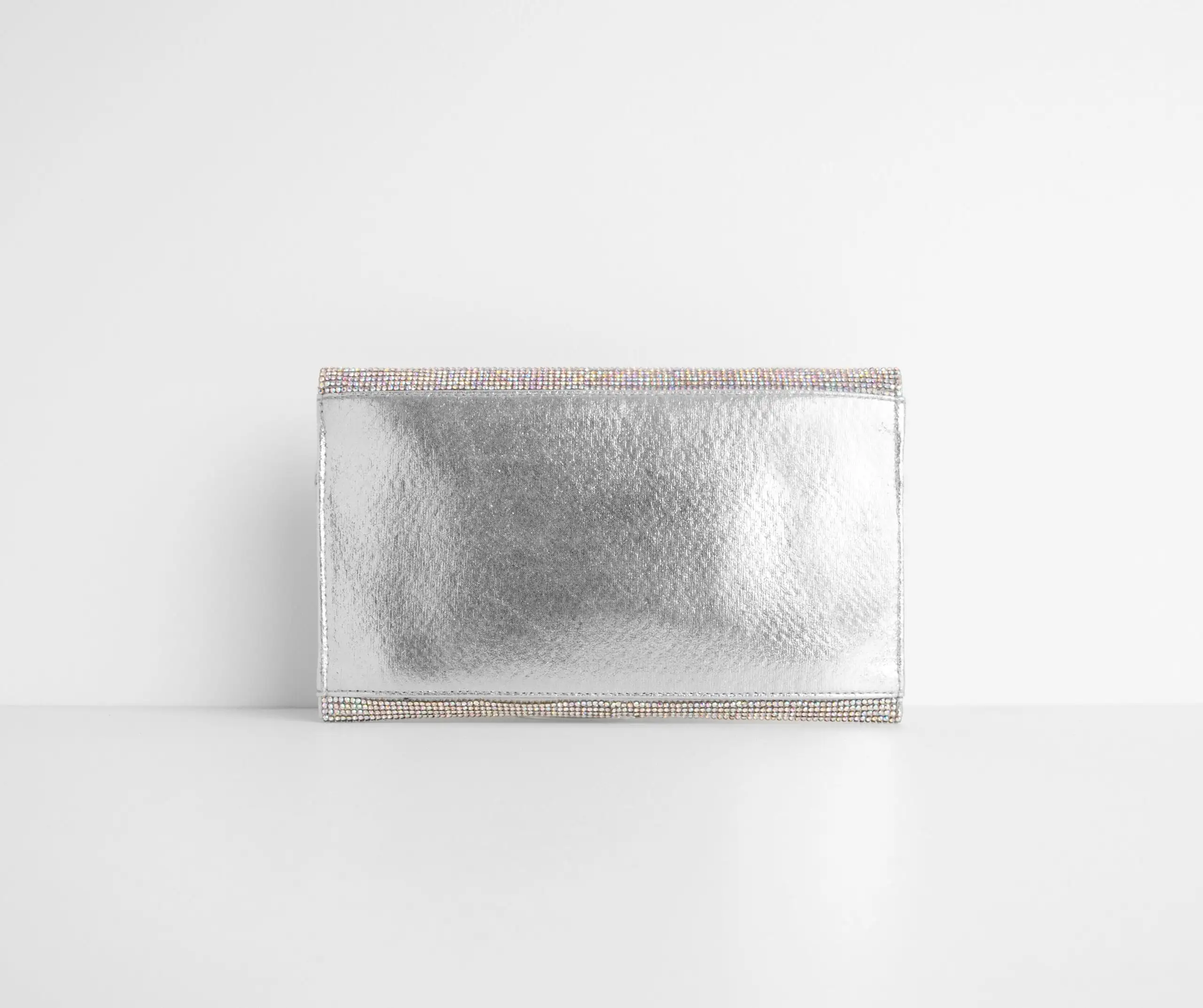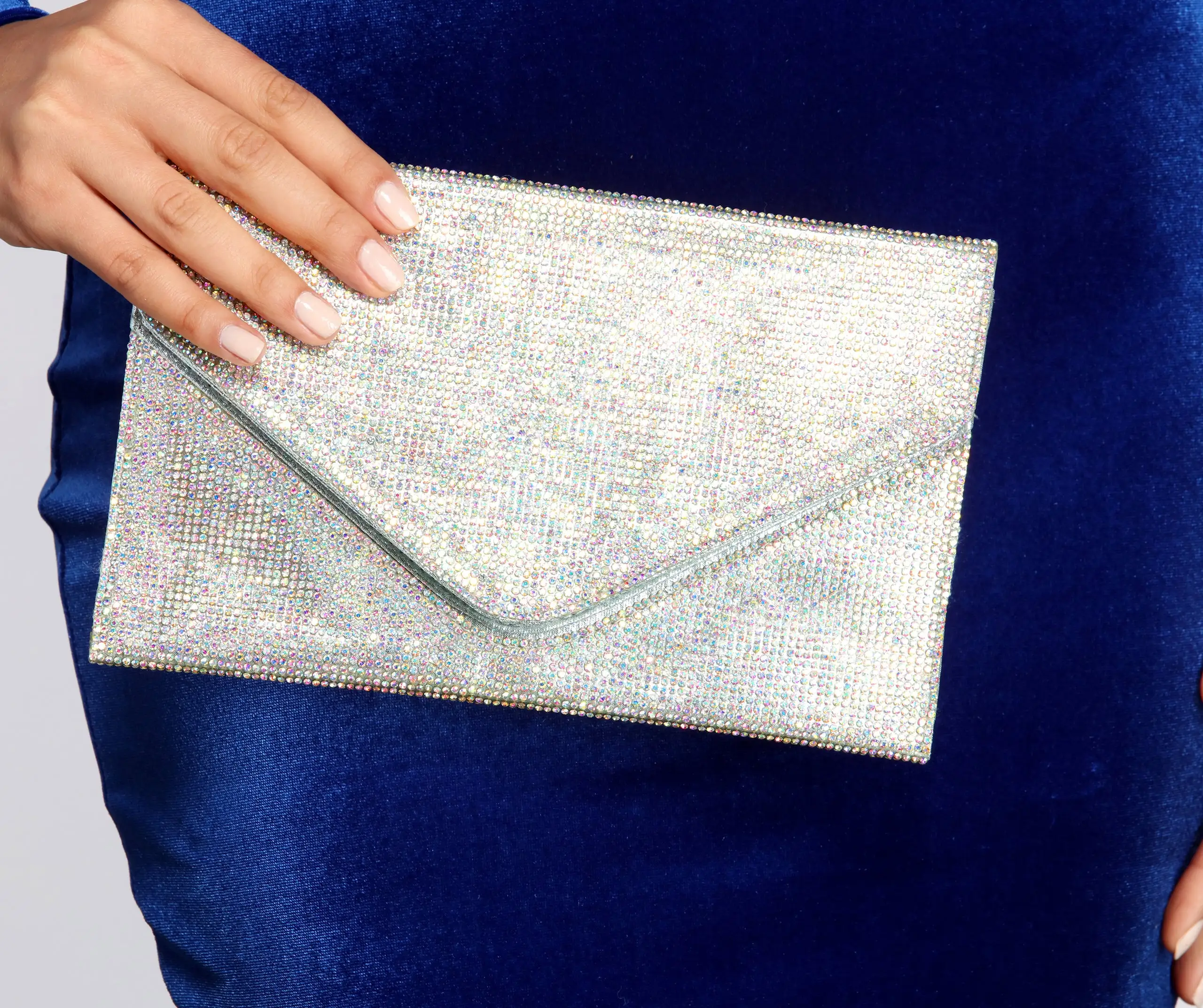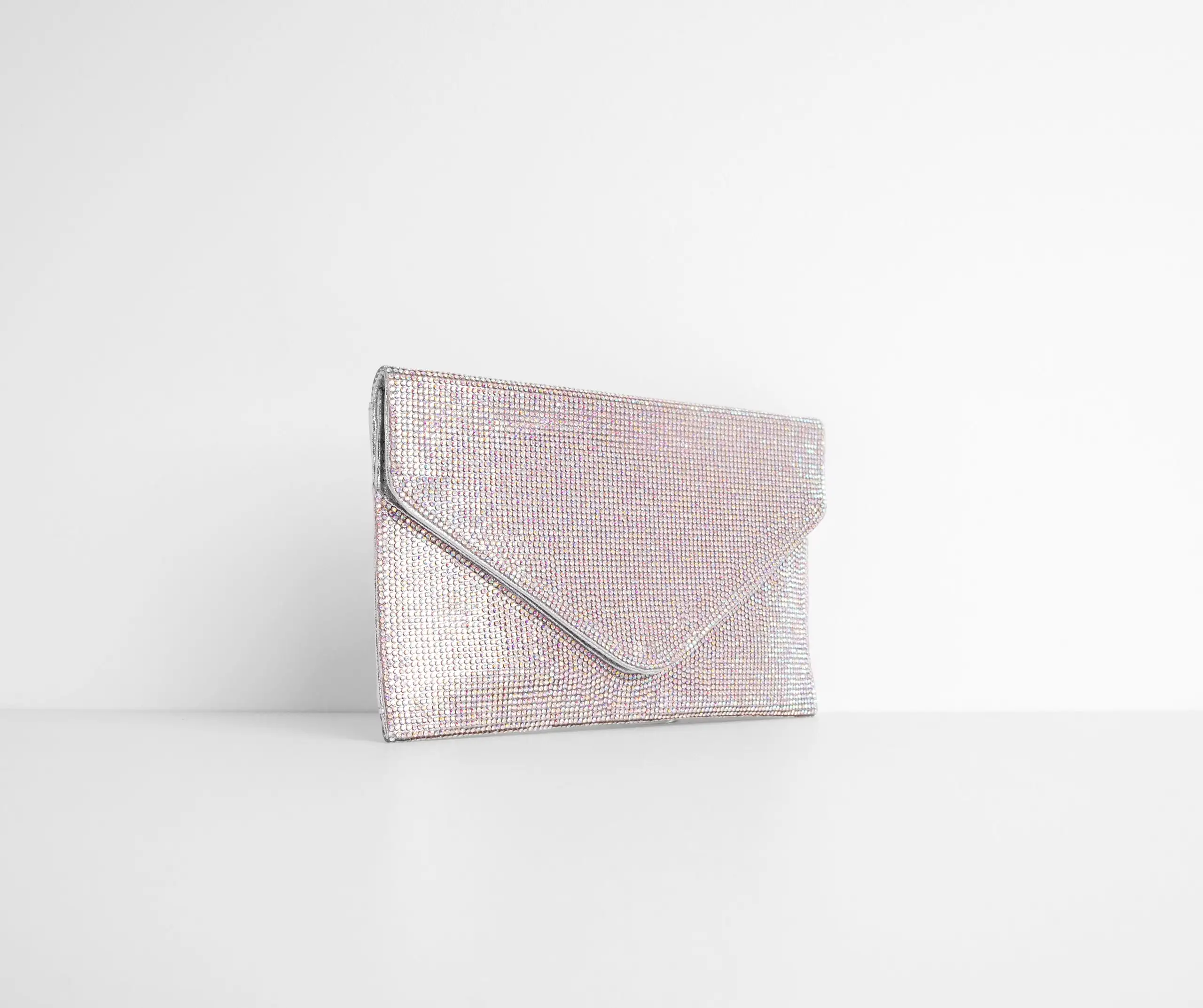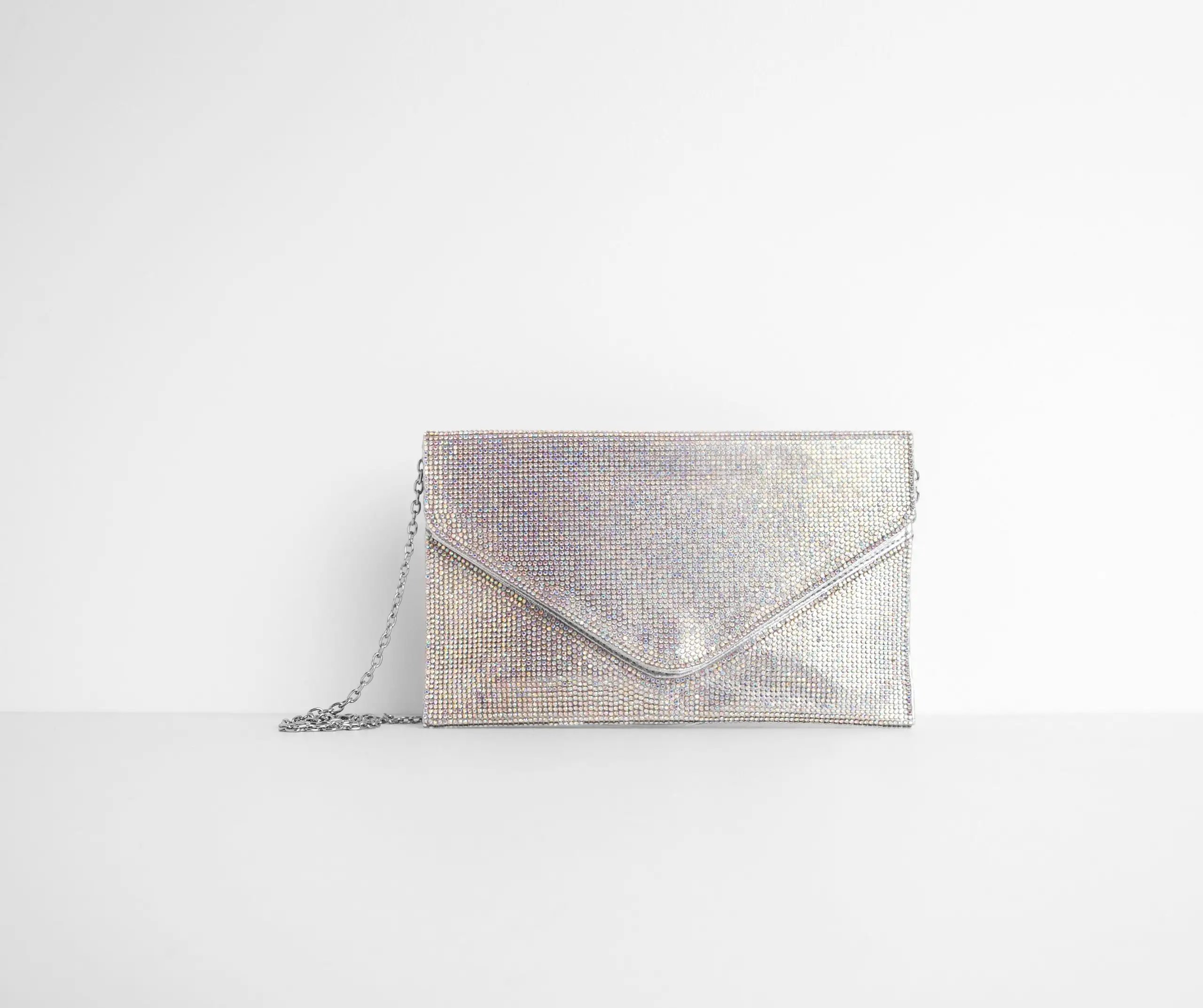 Sparkle and dazzle them all with a clutch made for a queen! This must have features a sleek envelope design with fold over closure and an all over Iridescent rhinestone embellished body that reflects an array of colors when the light is caught! Includes a dainty chain shoulder strap. Don’t forget to pick up the matching pumps to complete your dazzling look!