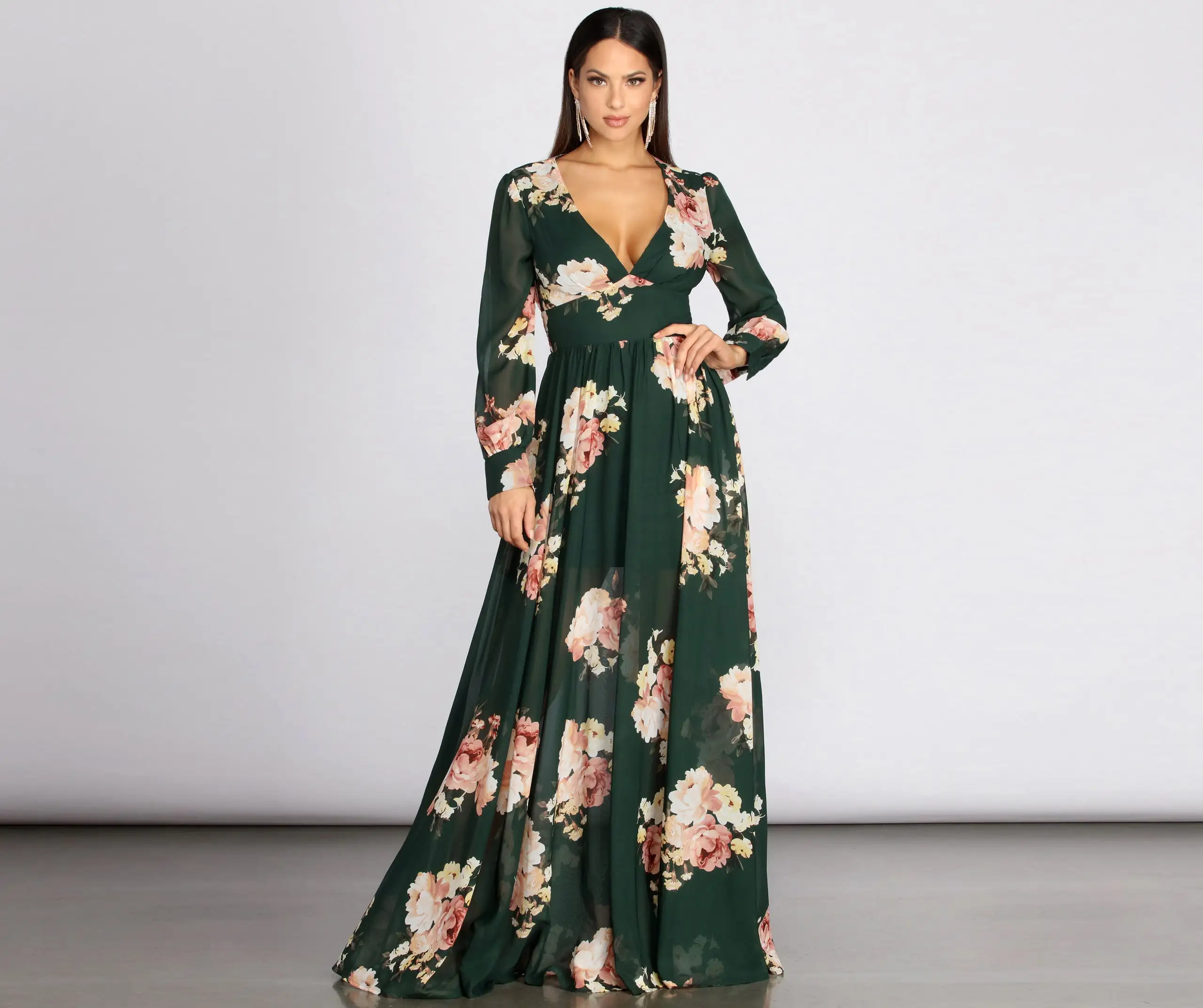 Look fabulous in florals with our beautiful Irina! Her flowy skirt and long sleeves are a dreamy and elegant touch to her form-flattering silhouette.