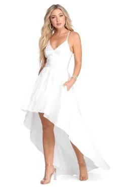 Our Isla white dress is pure perfection. It features a deep V neckline with spaghetti straps that lead to a gorgeous lace back, and its high-low skirt has the perfect amount of volume with pockets as an added bonus! The taffeta fabric offers a light sheen with a structured look and minimal stretch. Includes two back zipper closures.