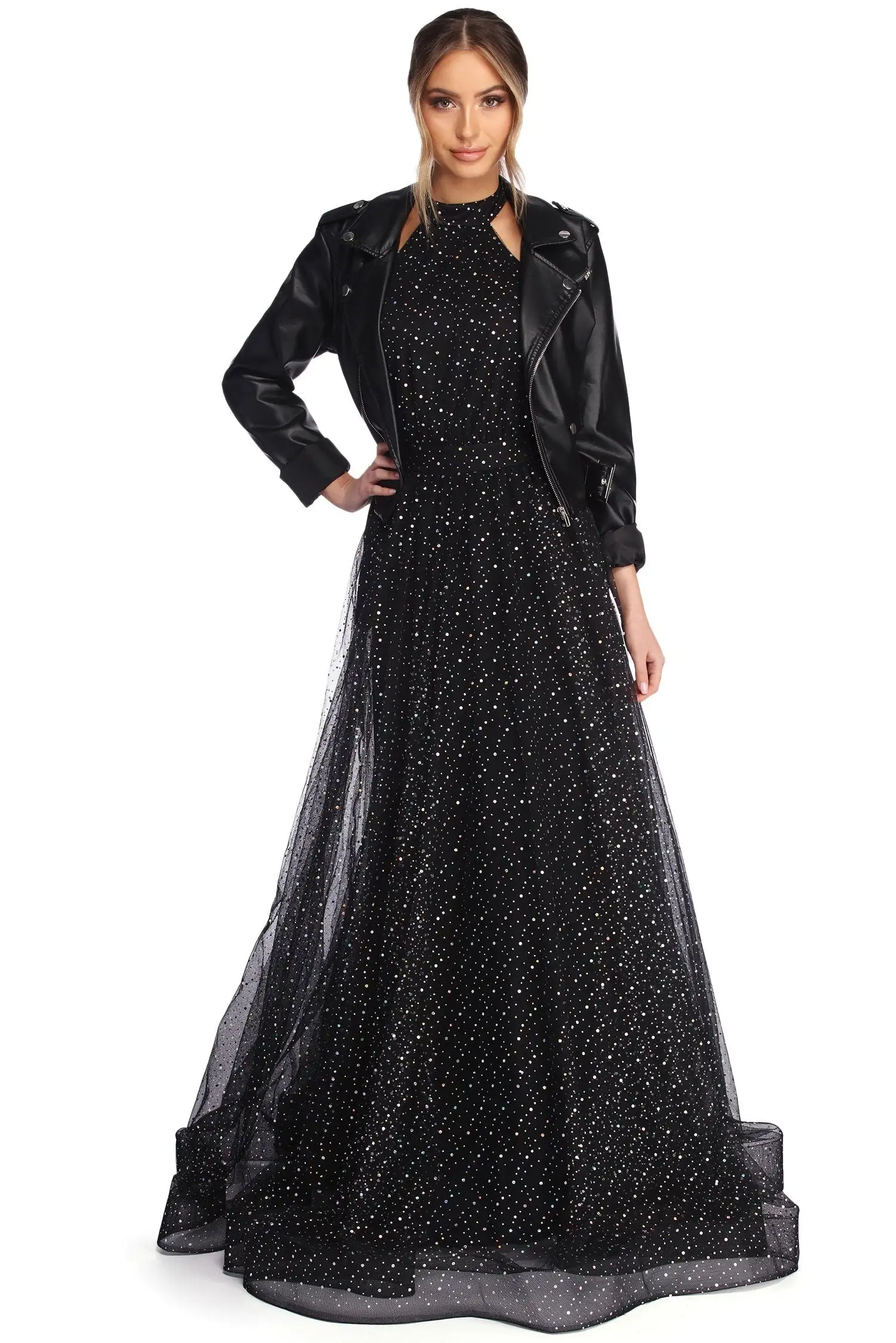 Light up the night like a twinkling star under an enchanted sky! Jeanette features a black hue, a halter neck with a racer bust and an open back. The slim fit bodice leads to a voluminous ball gown silhouette accented with a petticoat to bring the drama! Her all over tulle fabric is adorned with speckles of shimmering dotted sequin accents throughout! Dress is composed of a lined tulle fabric that offers a form hugging fit with minimal stretch.