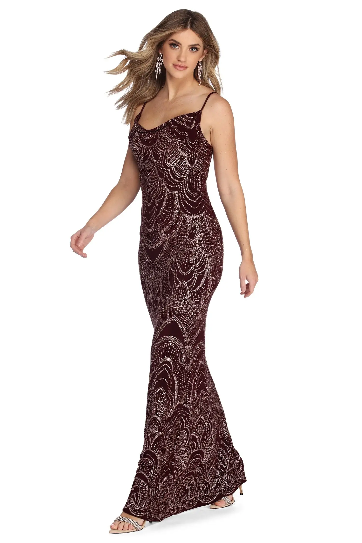 Light up the night in glamorous glitter in our alluring Jessa ivory dress! She features a sleeveless bodice, a cowl neckline and narrow straps. Her bohemian inspired print is composed of a gold glitter detail that adds plenty of shine from any angle! She is composed of a lined mesh fabric that offers a curve hugging fit with a moderate stretch.