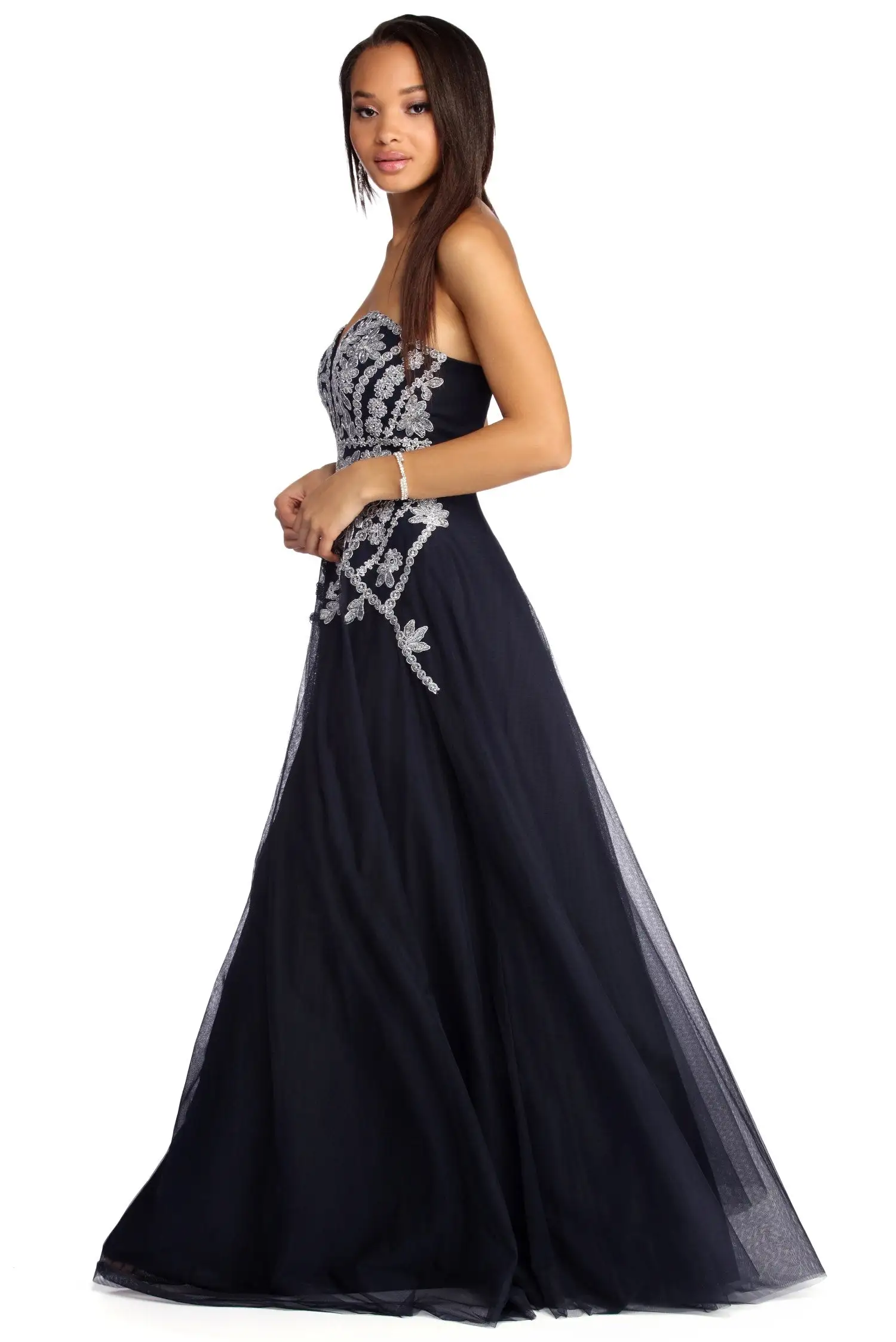 Make an enchanting entrance in the ever-captivating Julie navy dress! She features a strapless sweetheart neckline with an an unlined mesh inset, a silicone no slip-strip, padded cups and built in boning. Her bodice is adorned with a floral applique detail and sparkling heat stones. Her floor length silhouette brings all the drama! Dress is composed of a lined mesh fabric that offers a relaxed fit with minimal stretch. Includes a hidden back zipper closure.