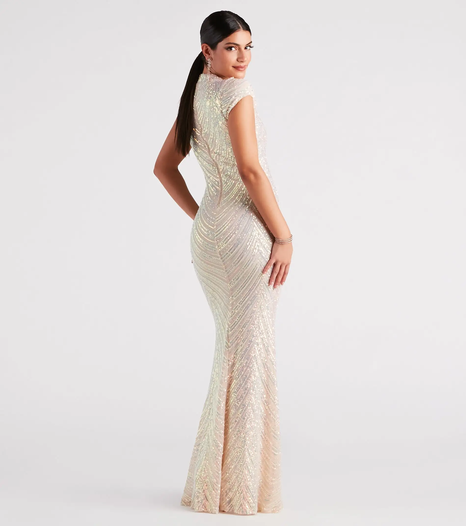 Iridescent sequins glisten in a striking pattern on the glamorous Justine formal dress destined to be your plus one for weddings or fancy celebrations! She shines in a classic cap sleeve, mock neck, and a form-flattering mermaid silhouette that leads to her floor-length hem. The formal dress is composed of a sequin-pattern mesh fabric with a stretchy knit lining. Complete the look with a chic