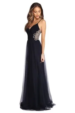 Shine from the inside out in our ever captivating Kara navy dress! She features a sleeveless bodice, a V neckline with an unlined mesh inset and sheer mesh insets on the waist that are adorned with dazzling rhinestones. Her back features a trendy keyhole and is complemented with a triple row fish hook clasp closure. Her slim fit waist leads to elongating ball gown silhouette with a sheer tulle overlay. Kara is composed of a combination mesh and smooth knit fabric that offers a form hugging fit with minimal stretch.