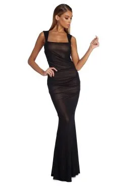 Make an unforgettable impression in our charming Kassandra dress! She features an all over black hue, a square neckline, wide shoulder straps and a partially open back with a single button closure at the nape of the nape. Her slim fit bodice leads to an elongating floor length silhouette that is accented with ruched detailing along the sides. Dress is composed of a black metallic mesh fabric that is lined with a nude hued lining to create a subtle two tone effect. Garment offers a form hugging fit with a moderate stretch.