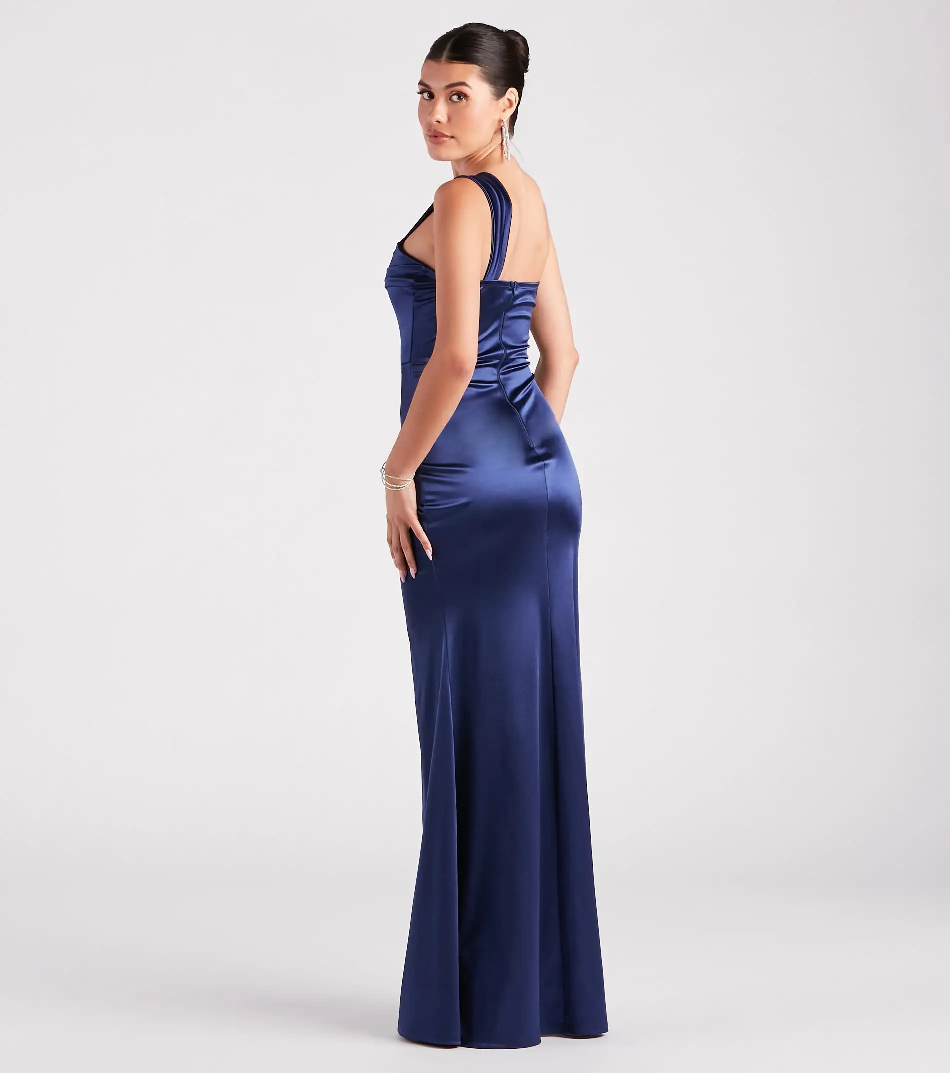 Sleek and sultry, the Kathie formal satin dress is destined to shine at banquets, galas, and black-tie weddings! She features a sophisticated one-shoulder neckline, a wide shoulder strap, a pleated side seam, a mermaid silhouette, and an asymmetrical high front slit along her graceful long hem. The formal dress is composed of luxurious satin-lined fabric with a sheen effect and minimal stretch. Complete the look with