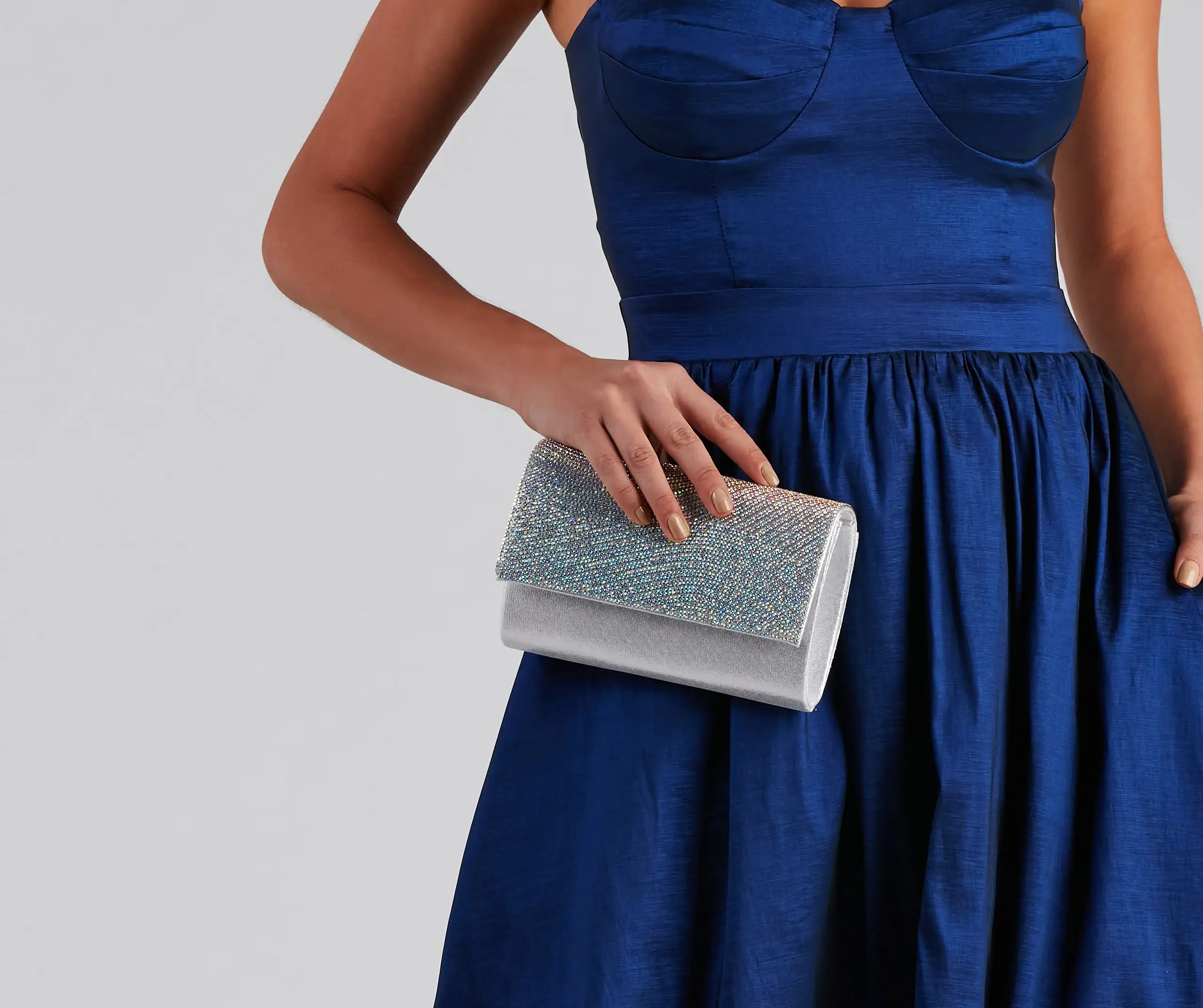 Day or night, you’ll be shining with this rhinestone flap clutch! It features a snap-button closure, detachable chain-link strap, satin interior with a pocket. Complete the look in glam