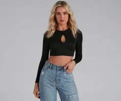 Unlock your stunning style with a top that is perf for creating your latest looks! The top features a crew neckline, a small keyhole at the bust, long sleeves, and a cropped hem. The top is composed of a brushed knit fabric that offers a form-hugging fit with a moderate stretch. Complete the look with high-waist