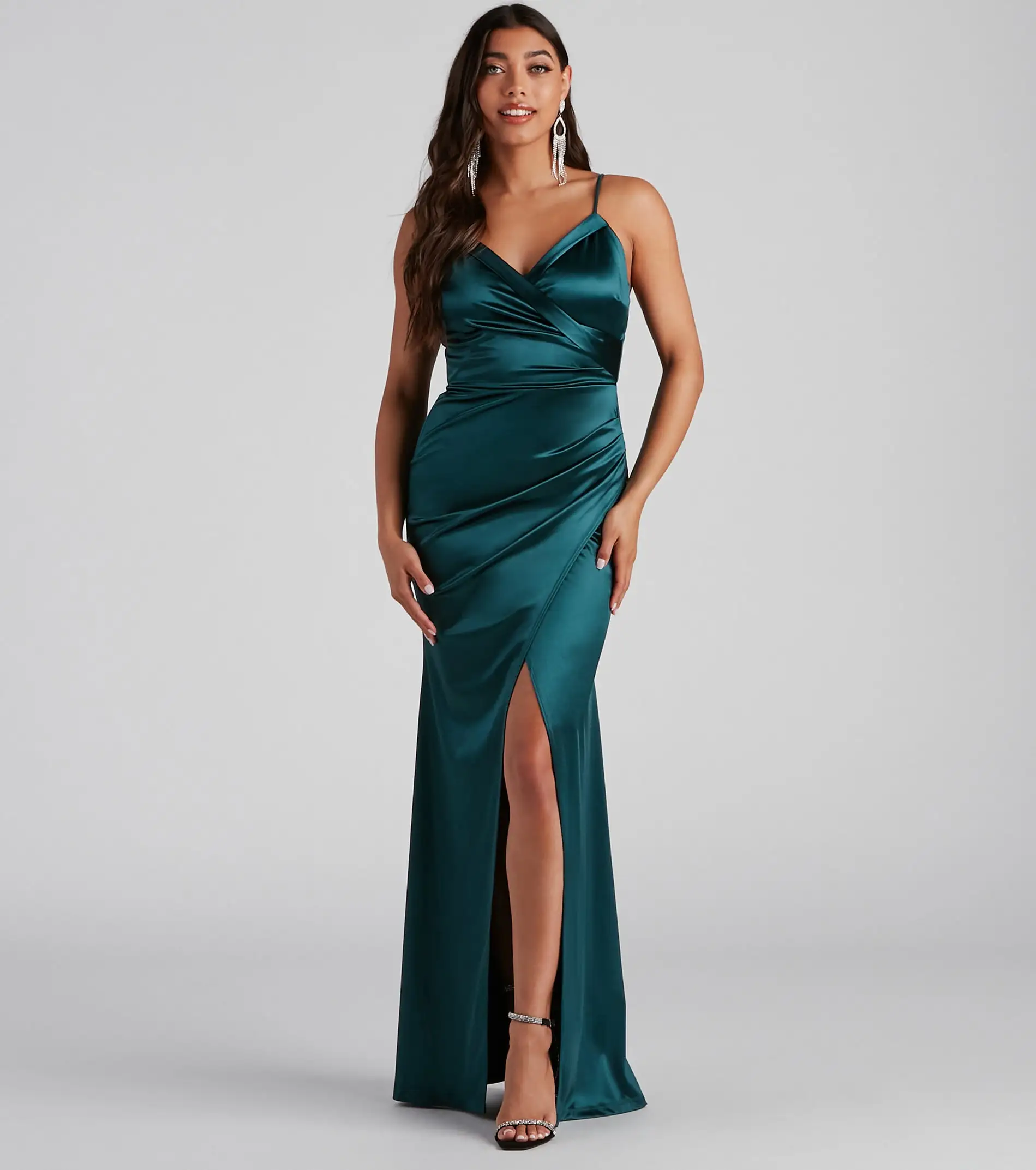 Wrap yourself in elegance tonight when you slip into a luxe gown! She is designed with a v neckline, adjustable spaghetti straps, padded cups, and a fold-over trim. Her bodice leads to a high waistline that gathers at one side and the start of a long skirt that wraps over. Her skirt leads to a floor-sweeping length and features a high slit at the center. She is lined at the bust and has a zipper closure at the back with a hook and eye closure that keeps her in place all night! Complete your formal outfit with a